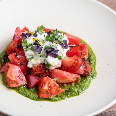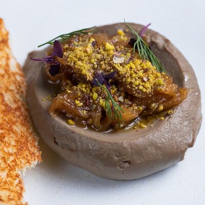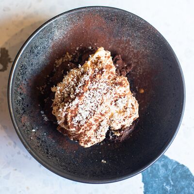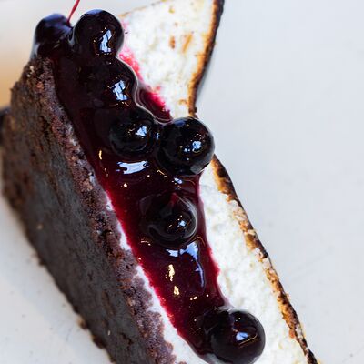 Шоколадный бисквит с кремом из сметаны с вареной сгущенкой с добавлением свежих сезонных (малина, голубика) ягод, с посыпкой из какао и тертого ореха пекан