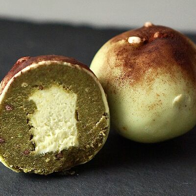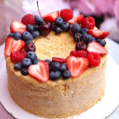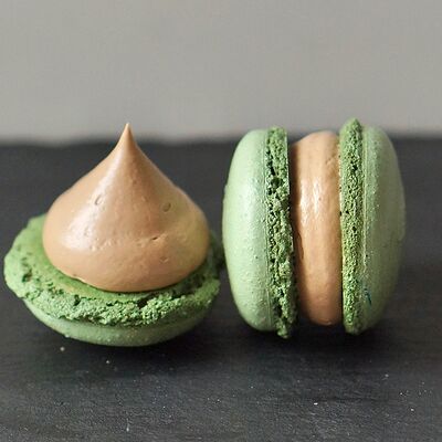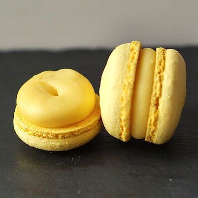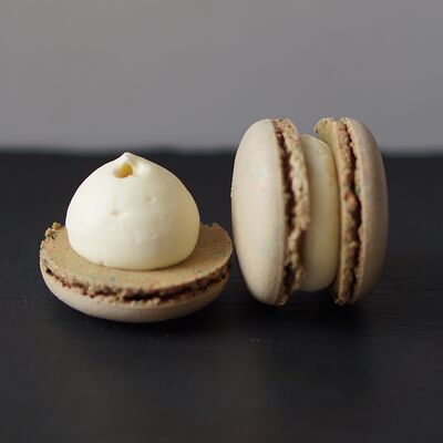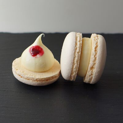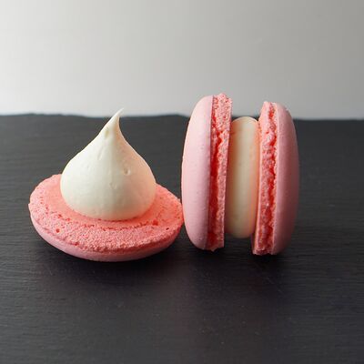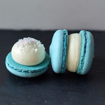 Мука миндальная, сахар, яичный белок, белый шоколад, сливки 33%, сироп Bubble gum