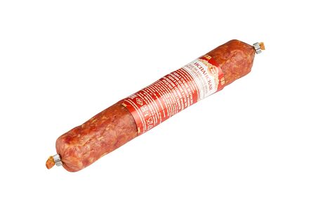 Свинина, шпик свиной, нитритно-посолочная смесь, пищевая клетчатка, пряности (перец черный, кориандр, чеснок), экстракт дрожжей, сахара, экстракты пряностей (перец красный, перец черный, тмин, паприка, кориандр), пищевые добавки, стартовые культуры. Изделие колбасное мясное, колбаса сыровяленая полусухая. Упакован под вакуумом