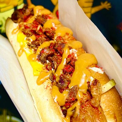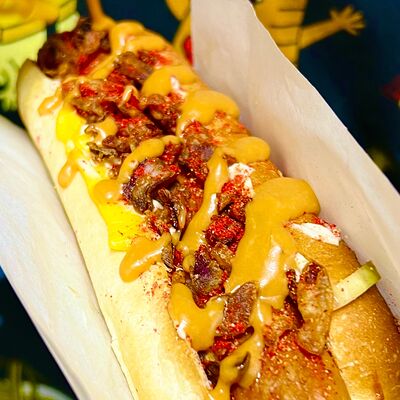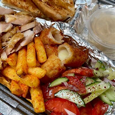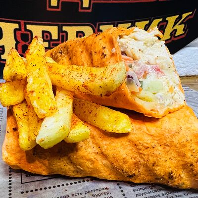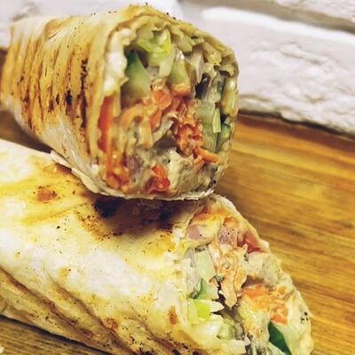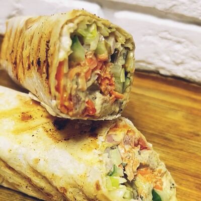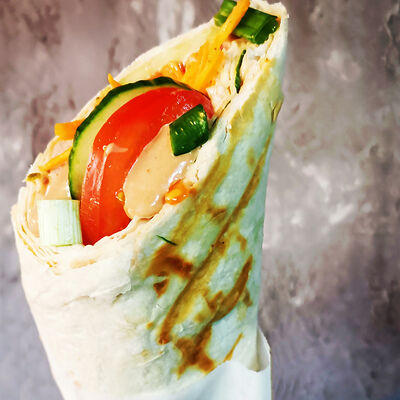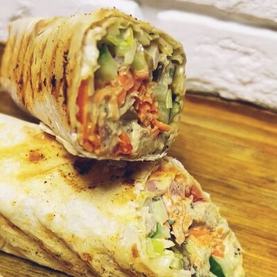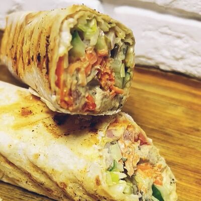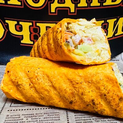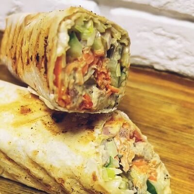 Лаваш, курица, копченый окорок, томаты, свежие огурцы, перчик халапеньо, соус шрирача, маринованная капуста, красный лук, соус ряженка
