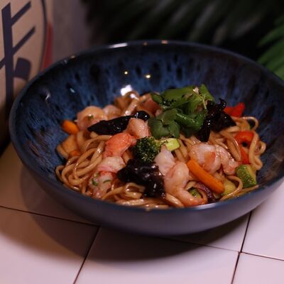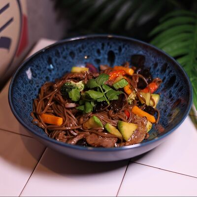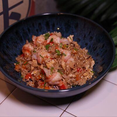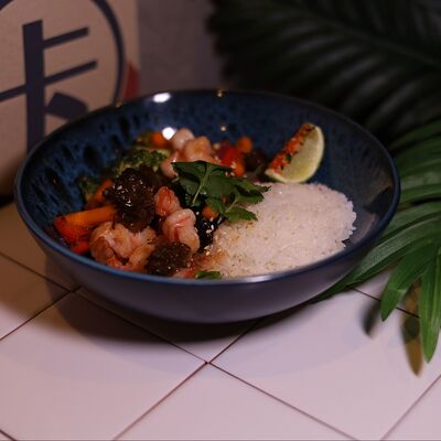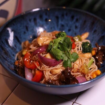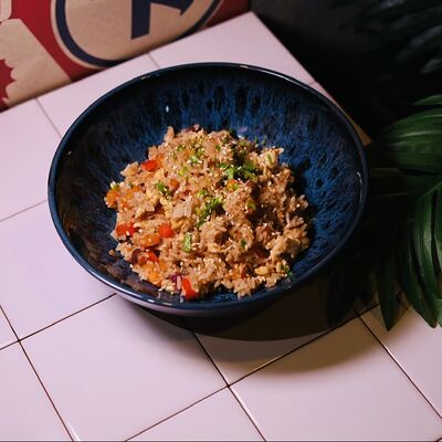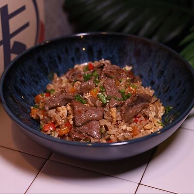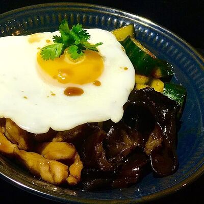 Нежная курочка, обжаренная с грибами в соусе терияки, выкладывается на подушку из риса, добавляются хрустящие (острые) огурцы и жареное яйцо