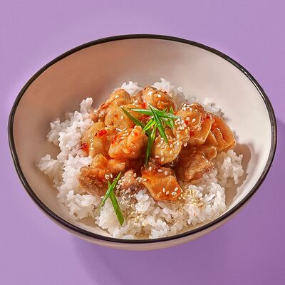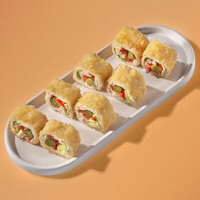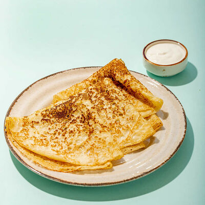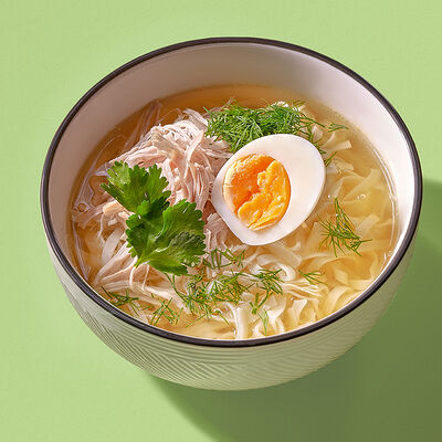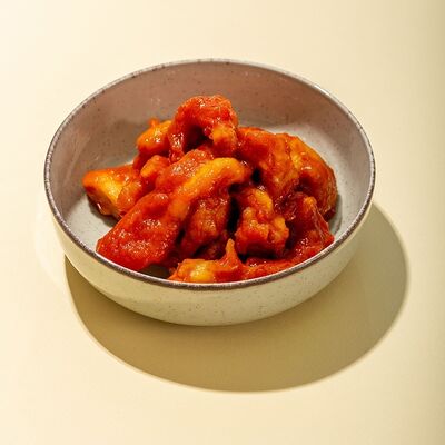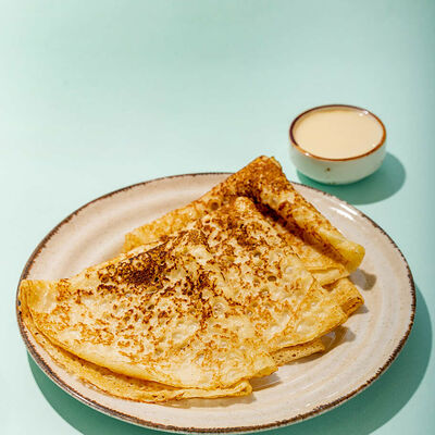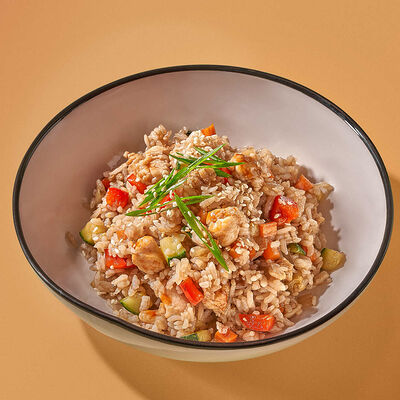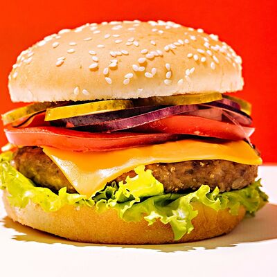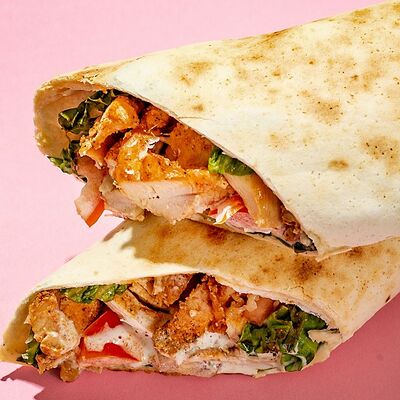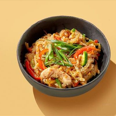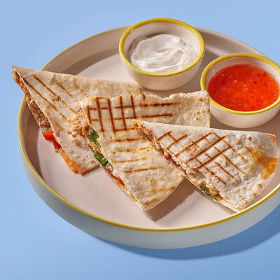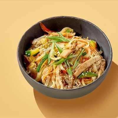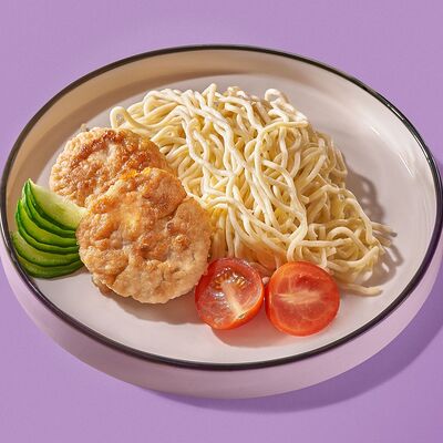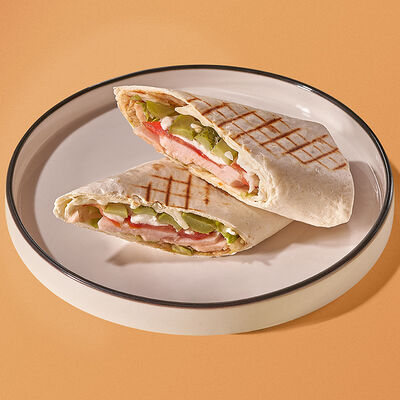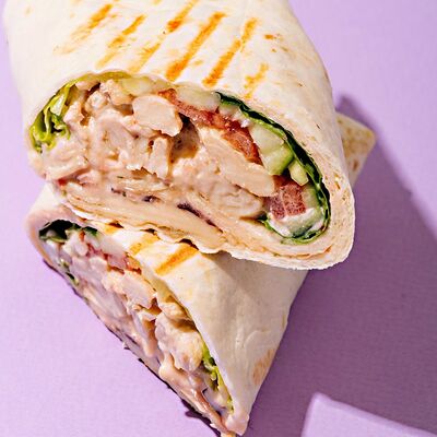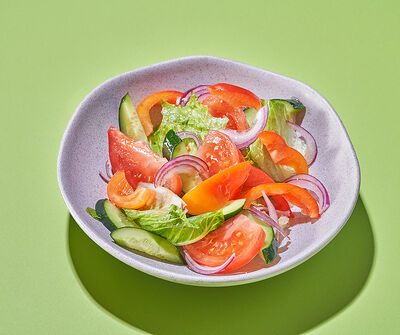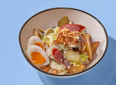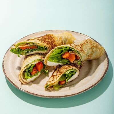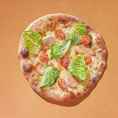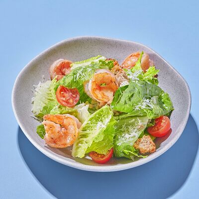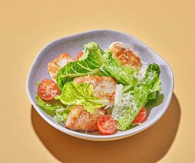Куриное филе, салат романо, черри, пармезан, гренки и соус цезарь