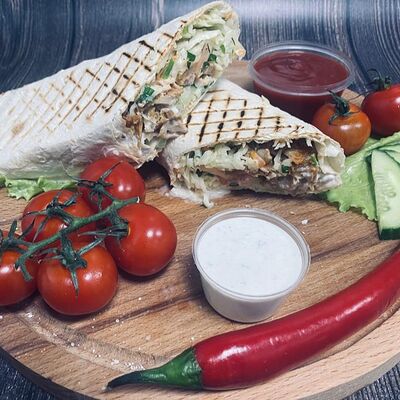 Армянский лаваш, салат из капусты, спелые томаты, свежие огурцы, лук красный, шашлык из курицы, соус фирменный чесночный