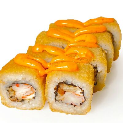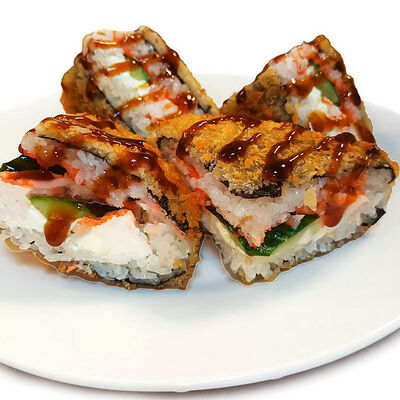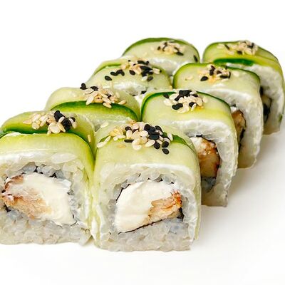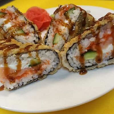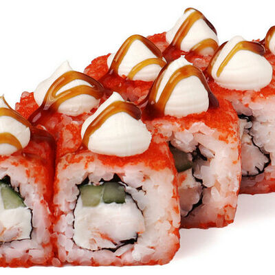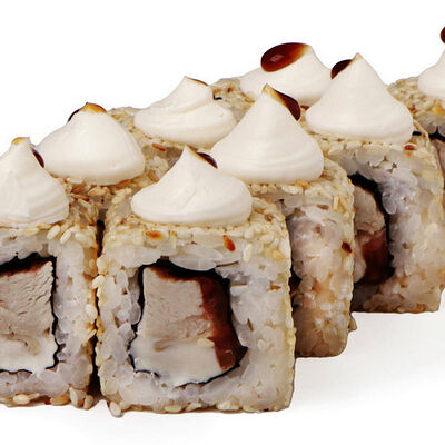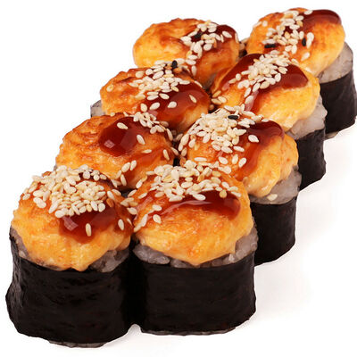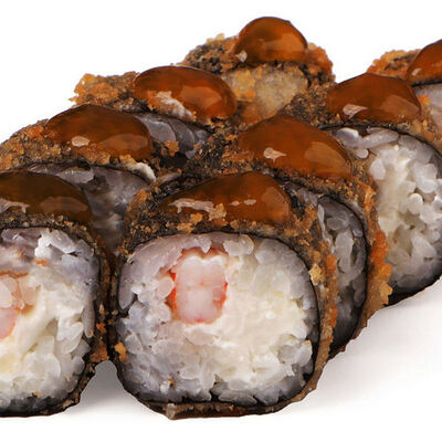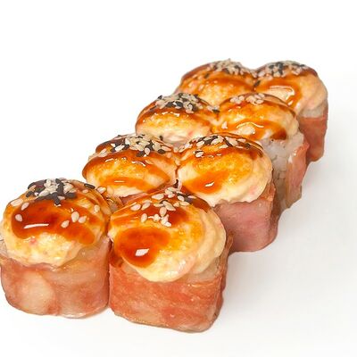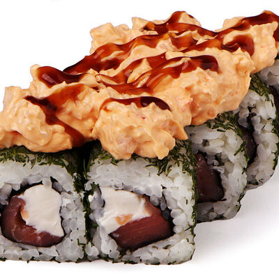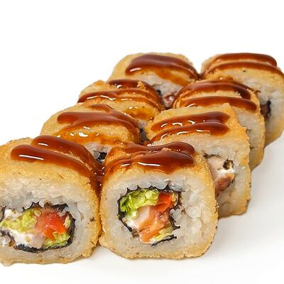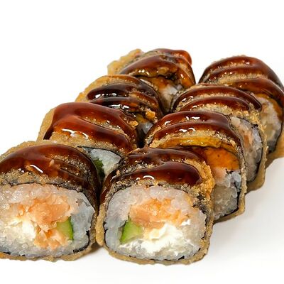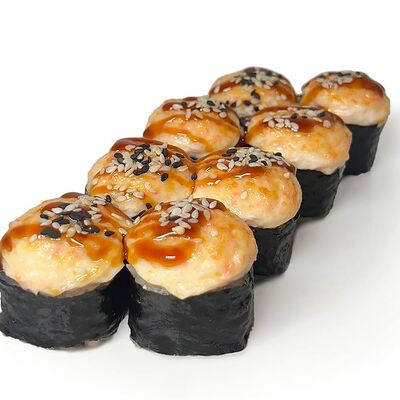 Классический запеченный ролл с лососем слабой соли, огурцом и сырной шапочкой, политый соусом унаги