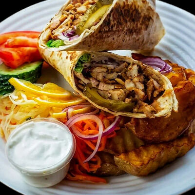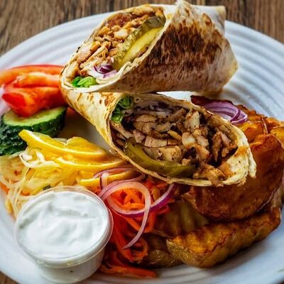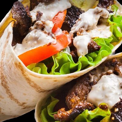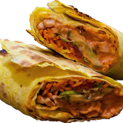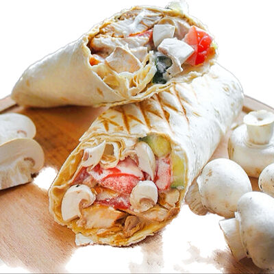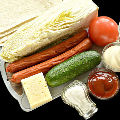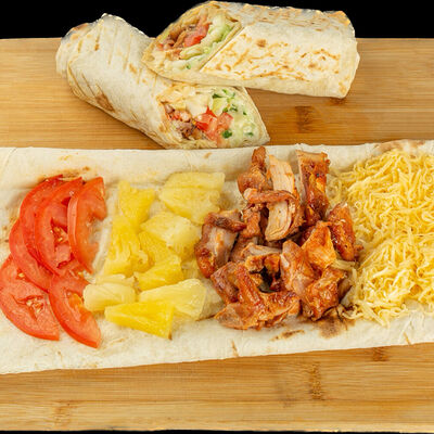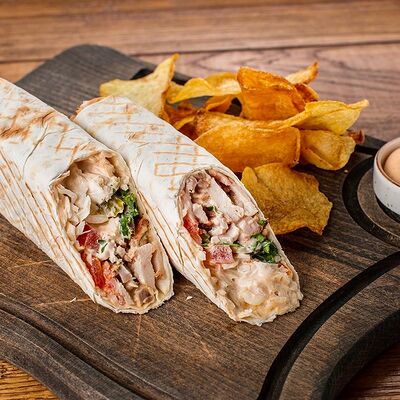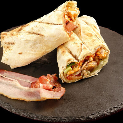 Лаваш, курица, помидоры, огурец свежий, капуста пекинская, лук красный, бекон, соус фирменный