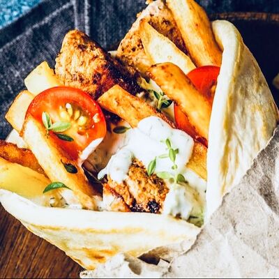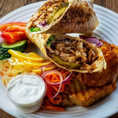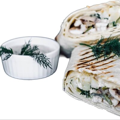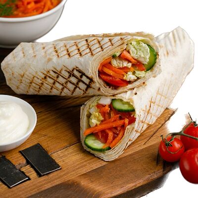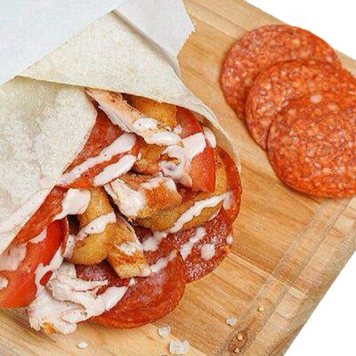 Лаваш, курица, помидоры, капуста пекинская, лук красный, корнишоны, шампиньоны, соус фирменный