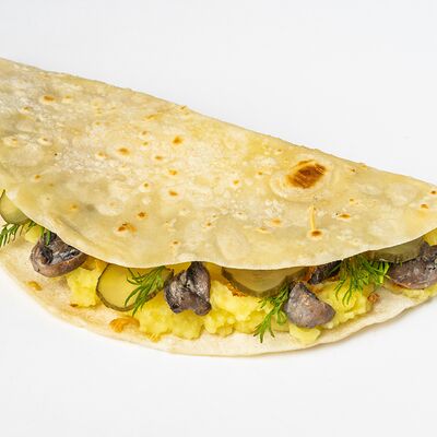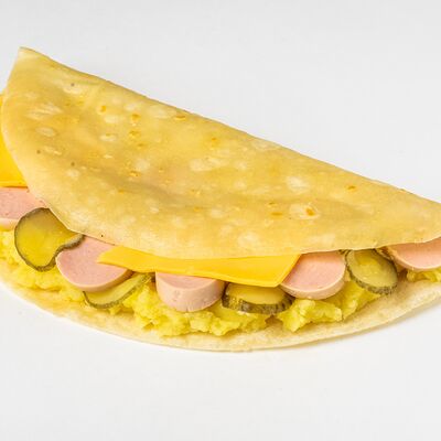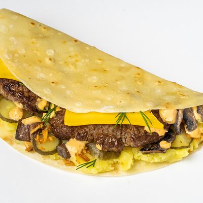 Котлета из мраморной говядины Прайм Биф, сыр чеддер, лук фри, жареные грибы в сливочном соусе, пюре картофельное ( картофель, соль, сливочное масло) и соус гриль