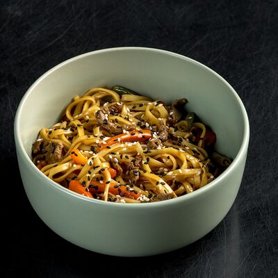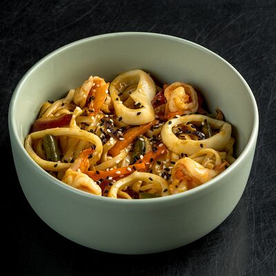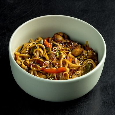 Удон, кисло-сладкий соус, куриное бедро, болгарский перец, красный лук, стручковая фасоль, морковь