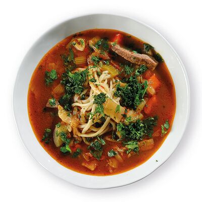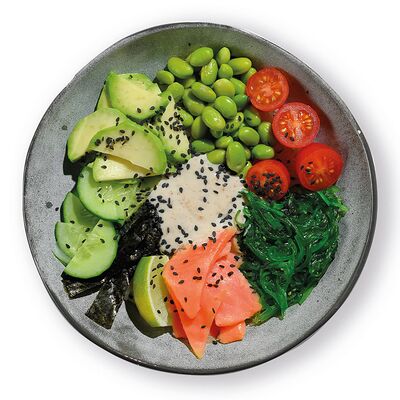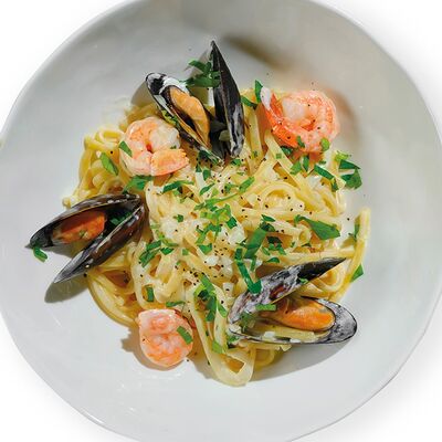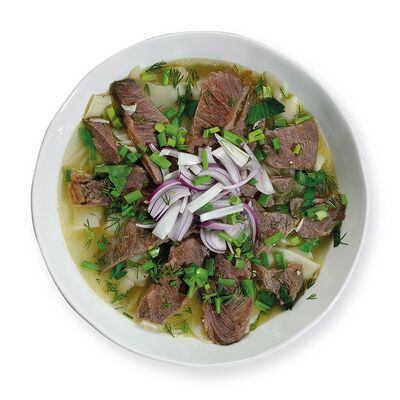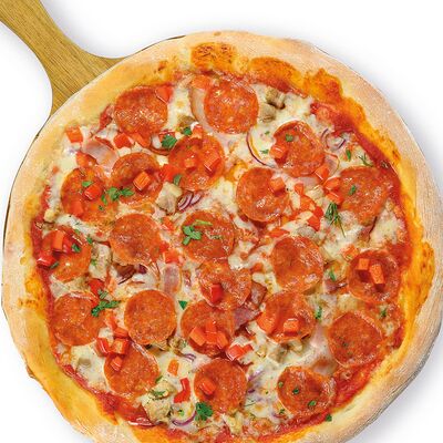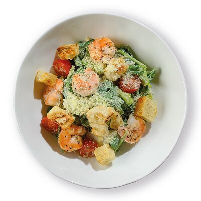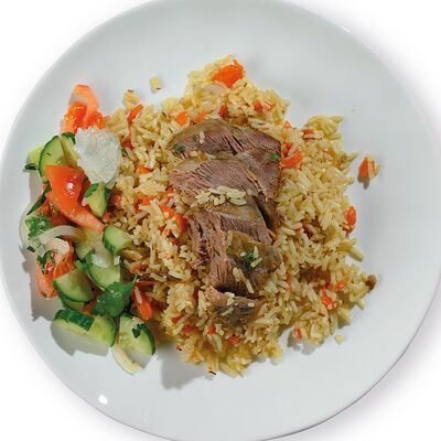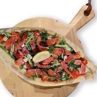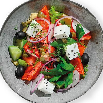 Свежие огурцы, помидоры, болгарский перец, красный лук, маслины, каперсы, сыр фета, заправка из хумуса и оливкового масла. Подается с домашней питой