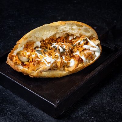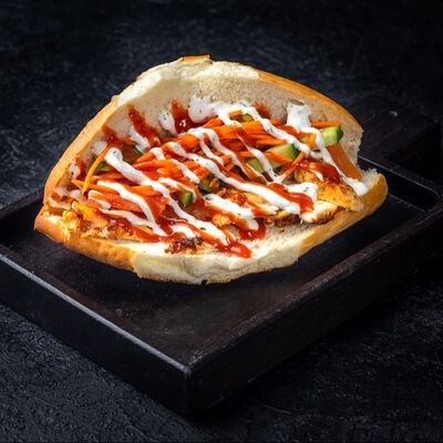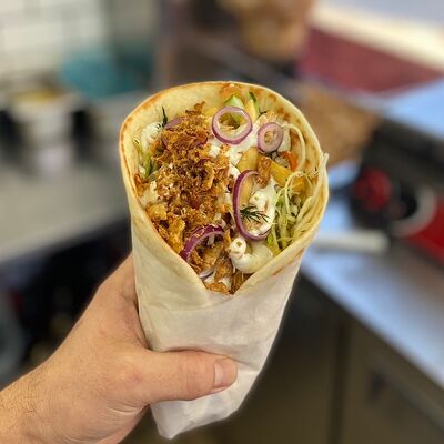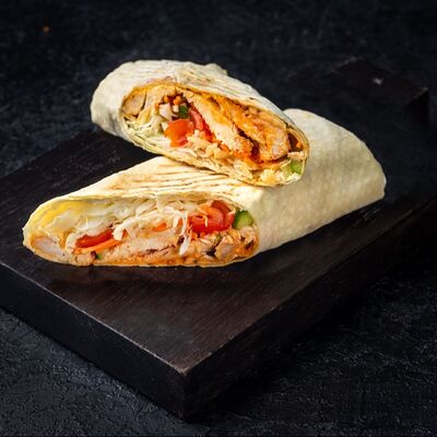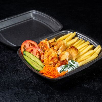 Пита, куриное мясо, капустный салат, картошка фри, помидоры, огурцы, жареный лук, свежий лук, фирменный соус
