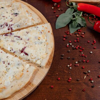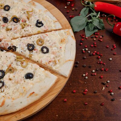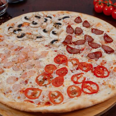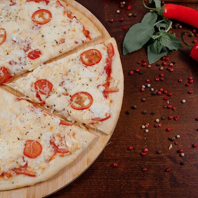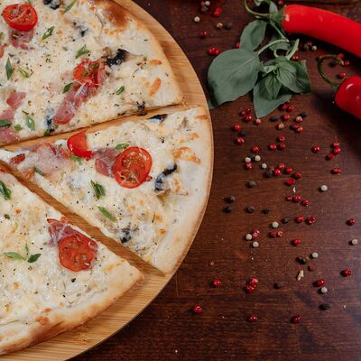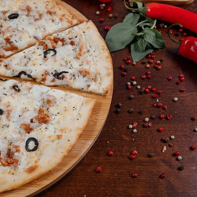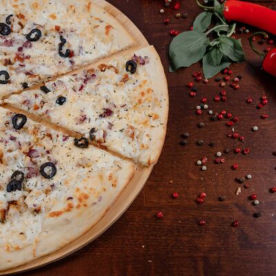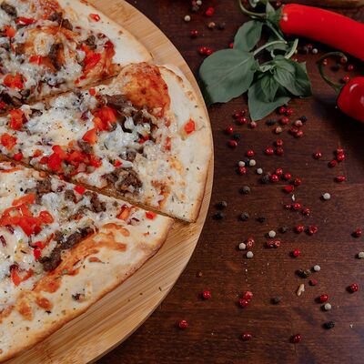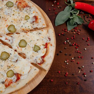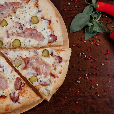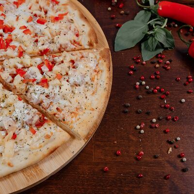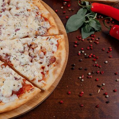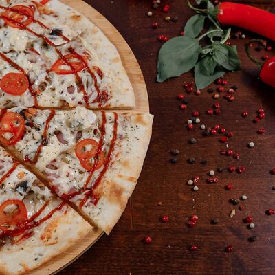 Охотничьи колбаски, курица копченая, томаты черри, моцарелла, гауда, соус спайси, пицца-соус (33 см)