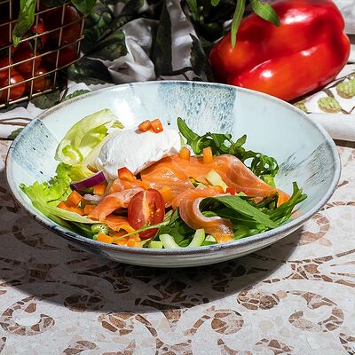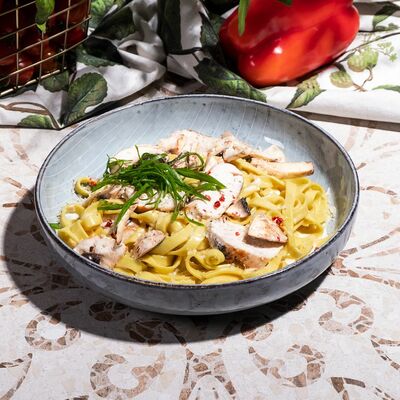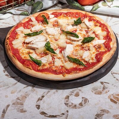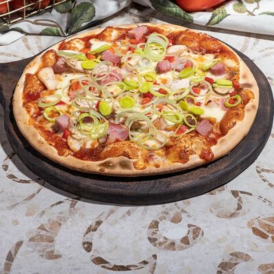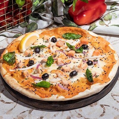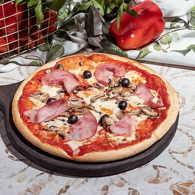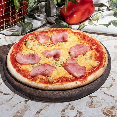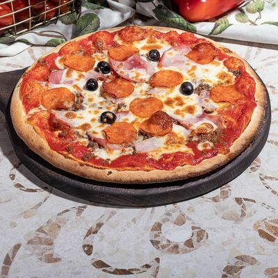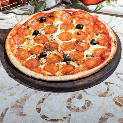 Пицца на классическом тонком тесте перчини из дровяной печи, пикантная колбаса пепперони, маслины, каперсы, сыр моцарелла и соус помодоро (30 см)