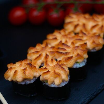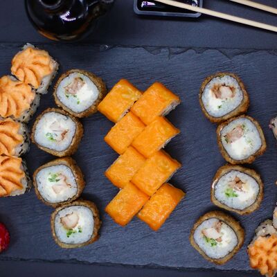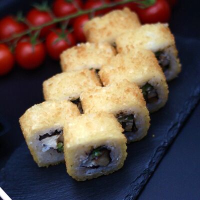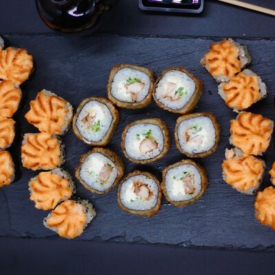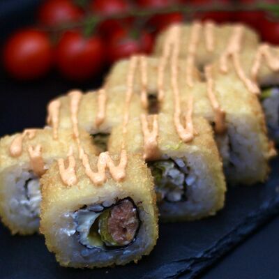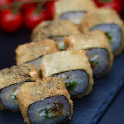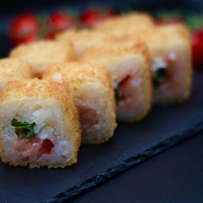 Японский рис, сливочный сыр, копченый лосось, салат айсберг, острый соус спайси, сухари панко