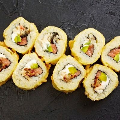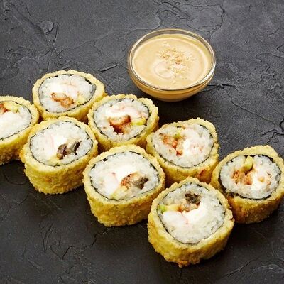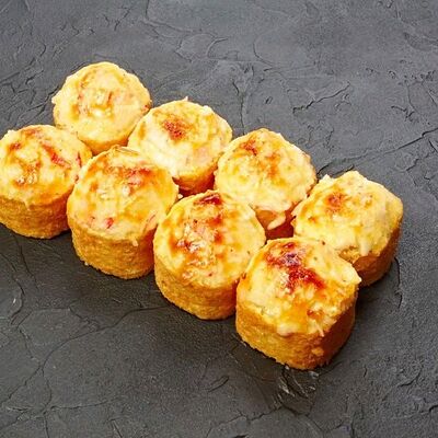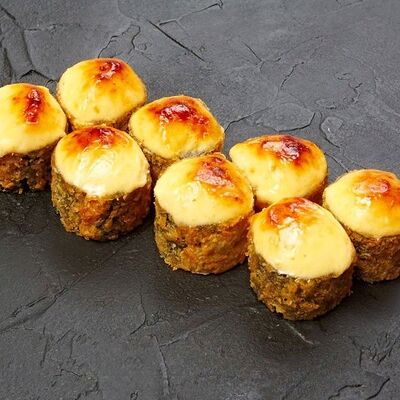Запеченный ролл с угрем, гребешком, авокадо и сливочным сыром, запеченный ролл с мясом мидий и чесночной пастой, запеченный ролл с лососем, тунцом, морским окунем и грибами шиитаки, запеченные роллы с лососем, тунцом, морским окунем, угрем