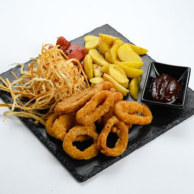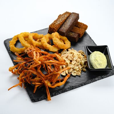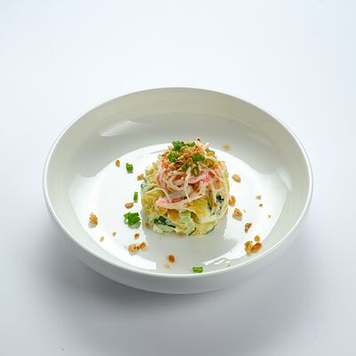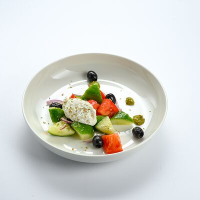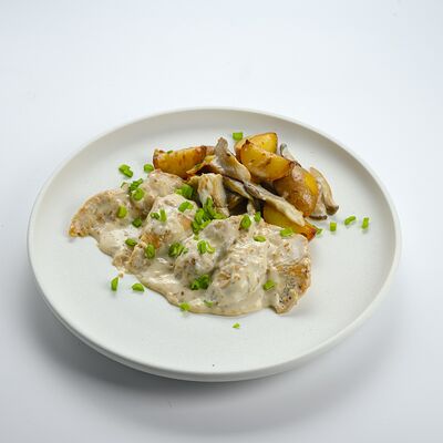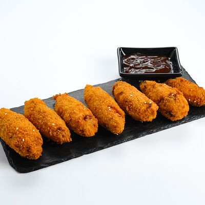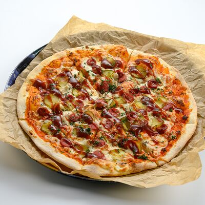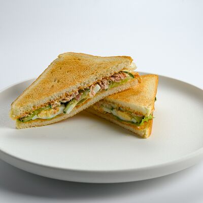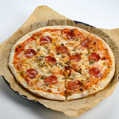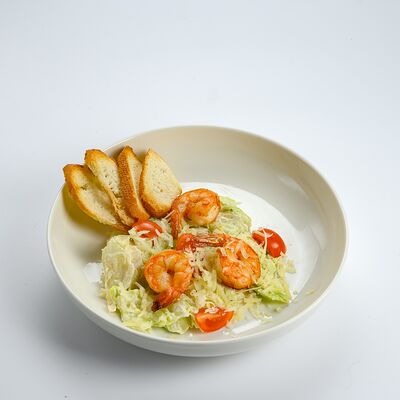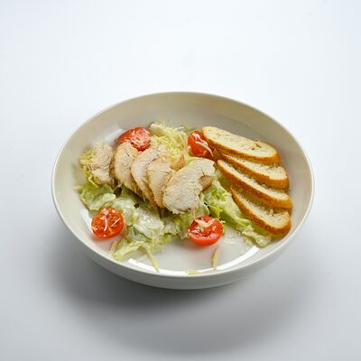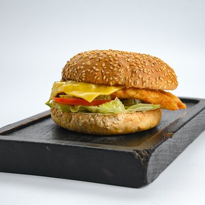 Котлета из куриного филе в хрустящей панировке, лист салата, свежий томат, соленый огурчик, сыр чеддер и соус цезарь