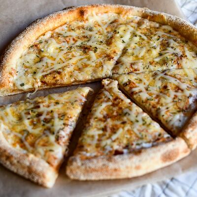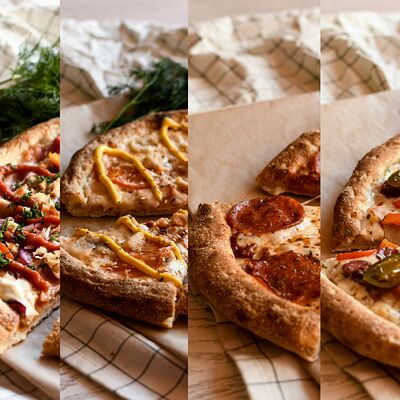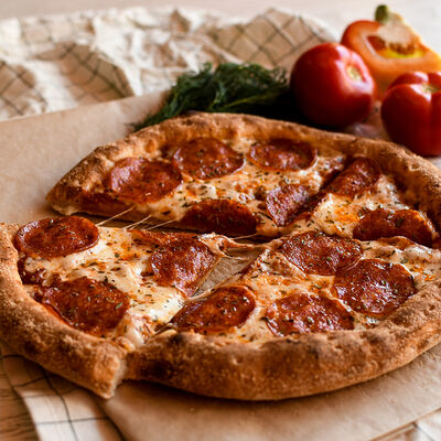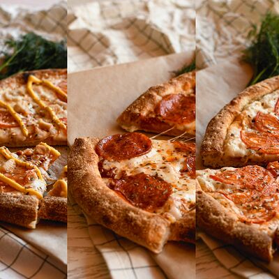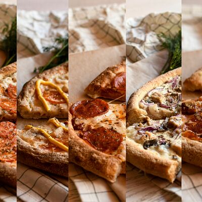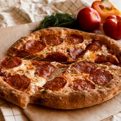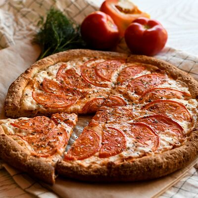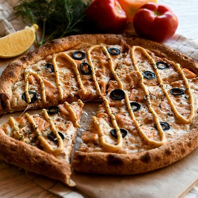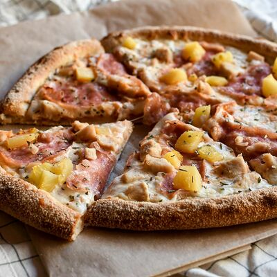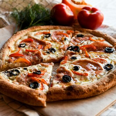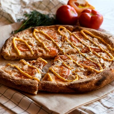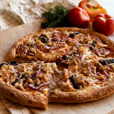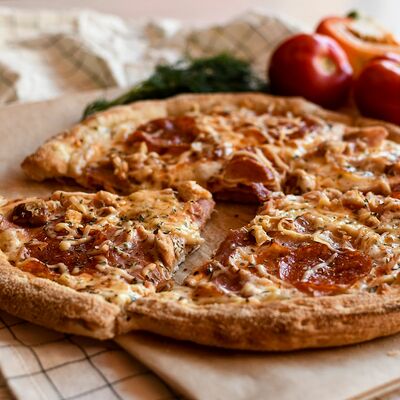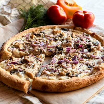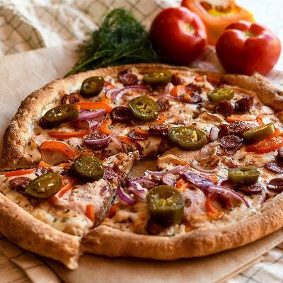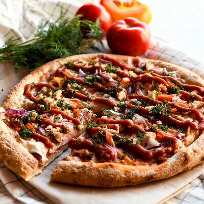 Тесто, соус для пиццы, сыр Моцарелла, бекон, ветчина, курица копченая, лук красный, болгарский перец, соус Барбекю, зелень свежая, орегано