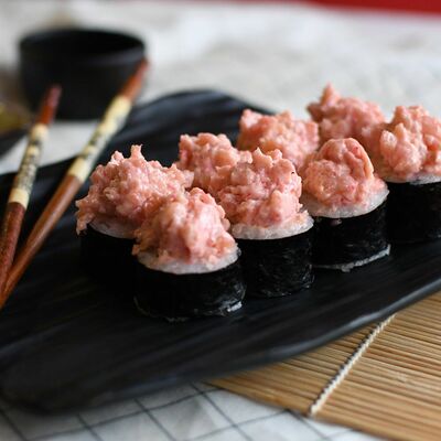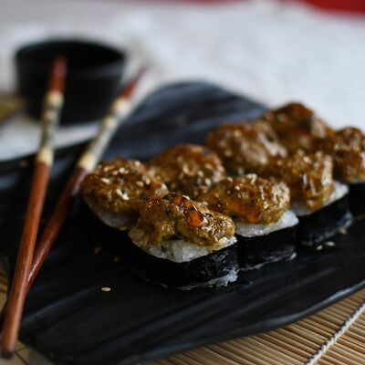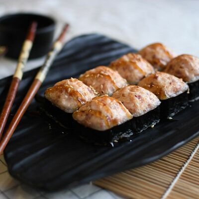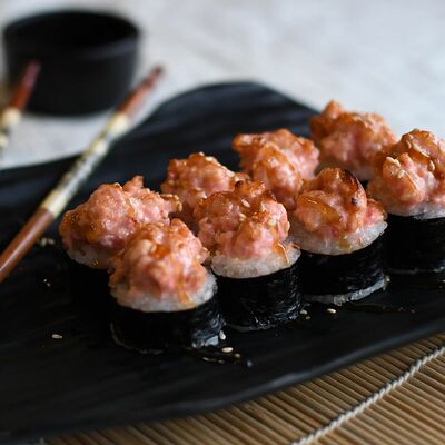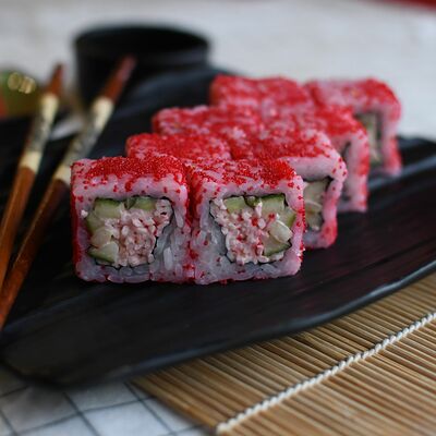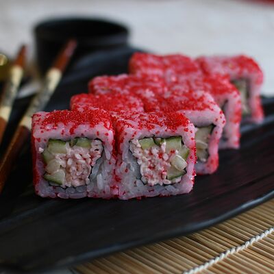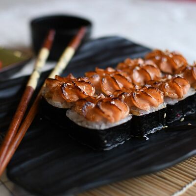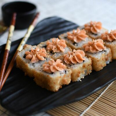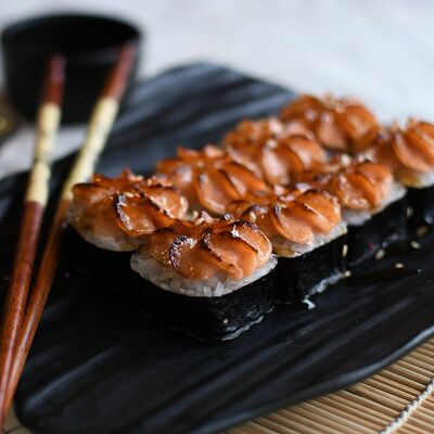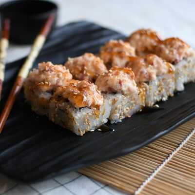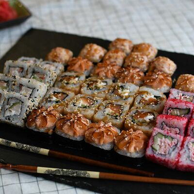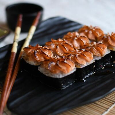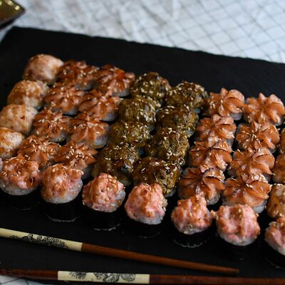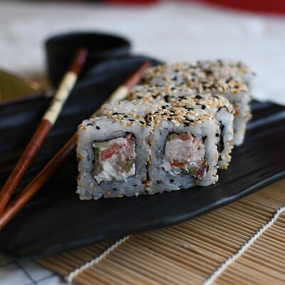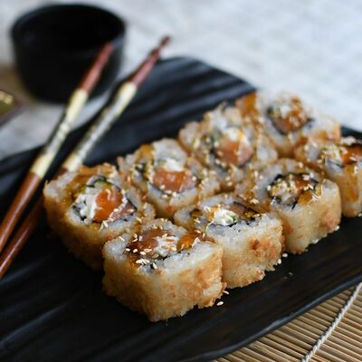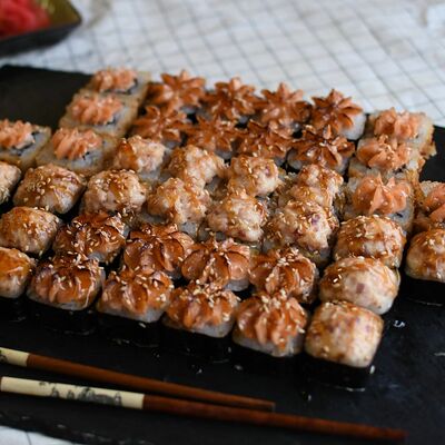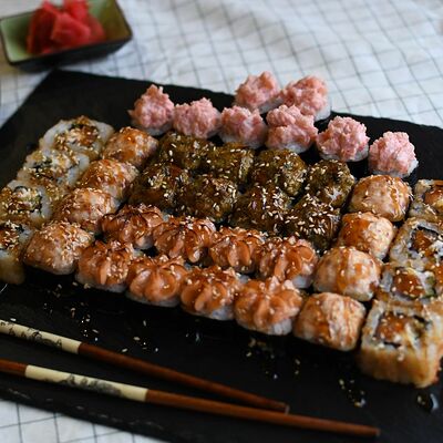 Лосось, окунь, сливочный сыр, омлет Томаго, соус чесночный, соус Унаги, кунжут