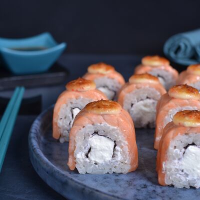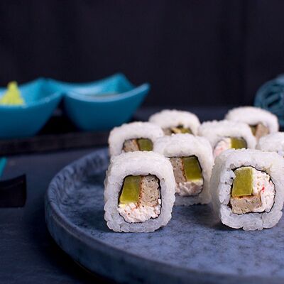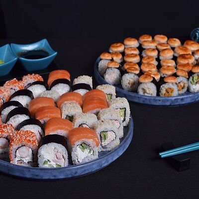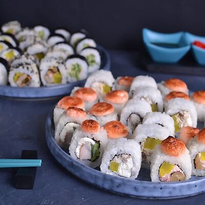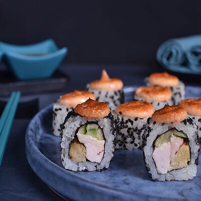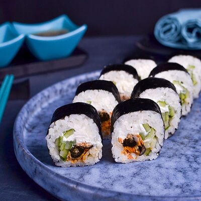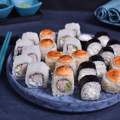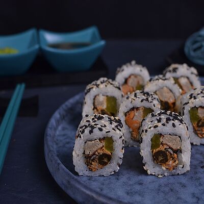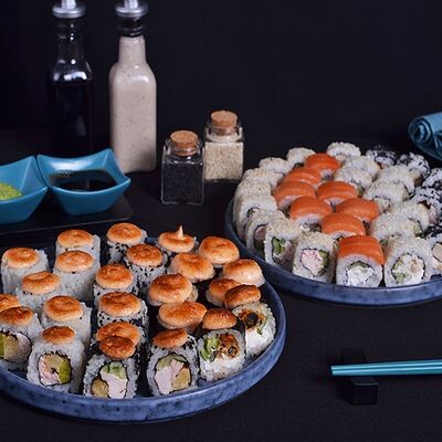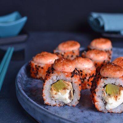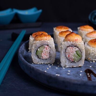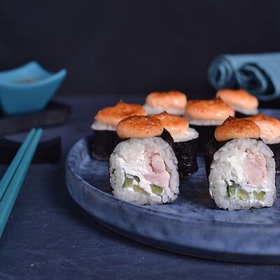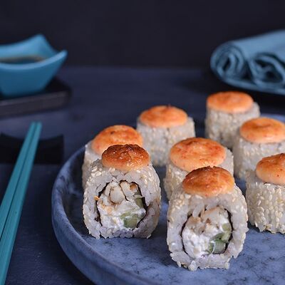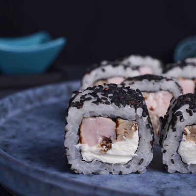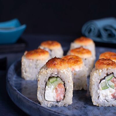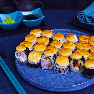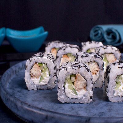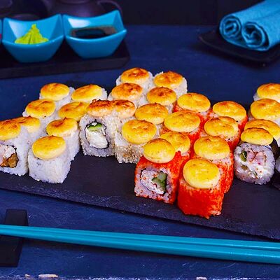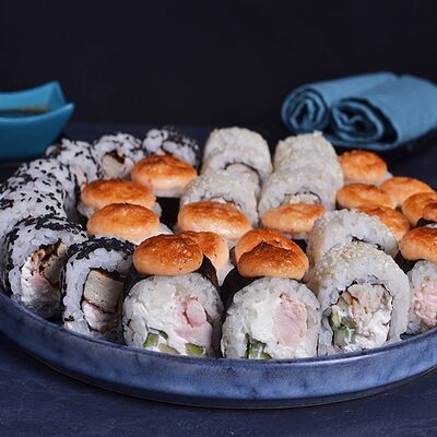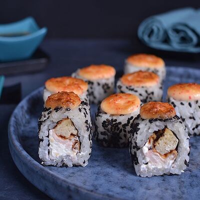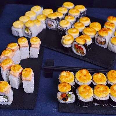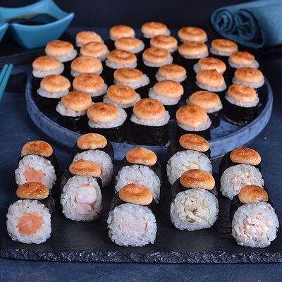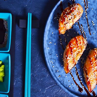 Мидии в раковине, рис, соус Яки, соус унаги, кунжут белый. 3 шт