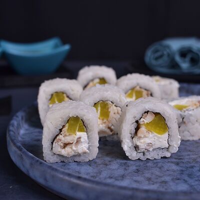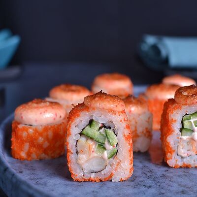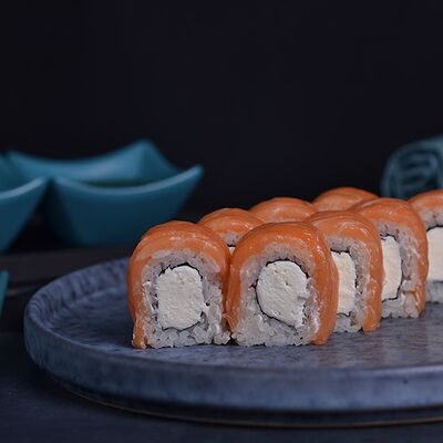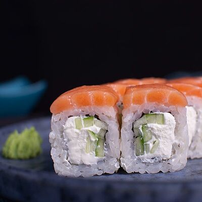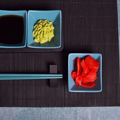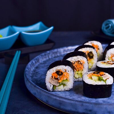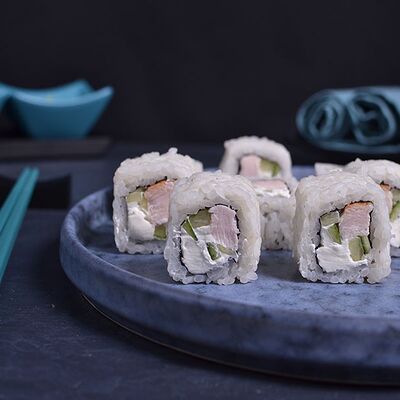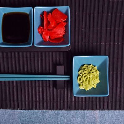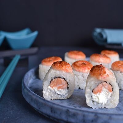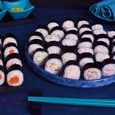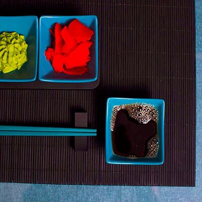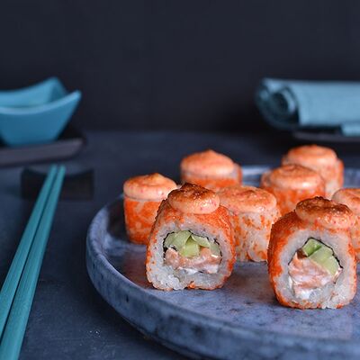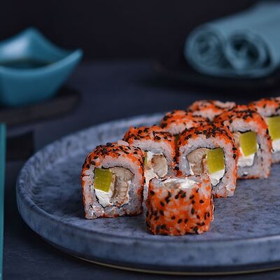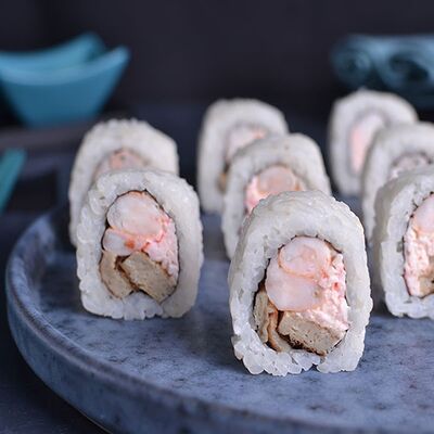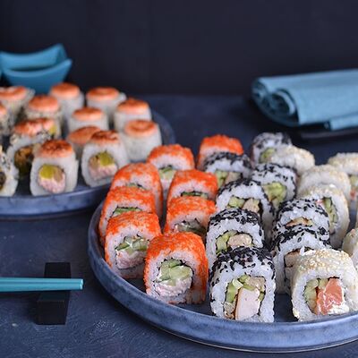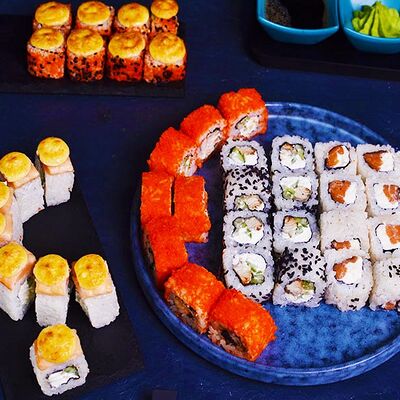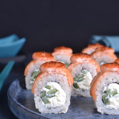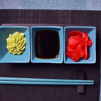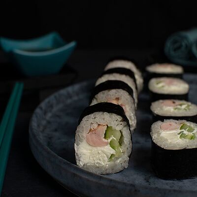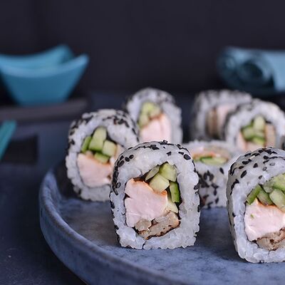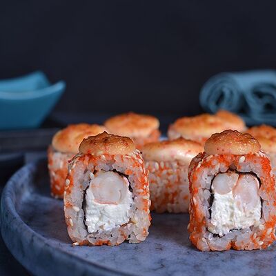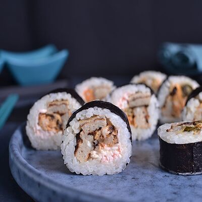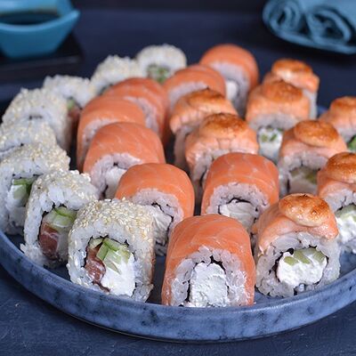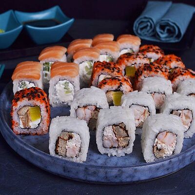 Мидии в раковине, рис, соус Яки, соус унаги, кунжут белый. 3 шт