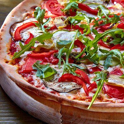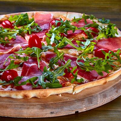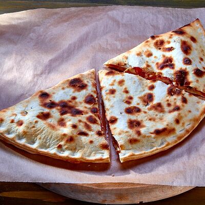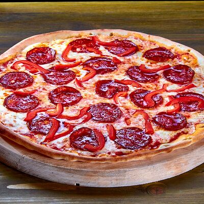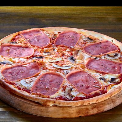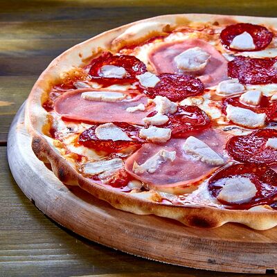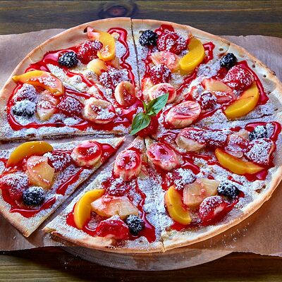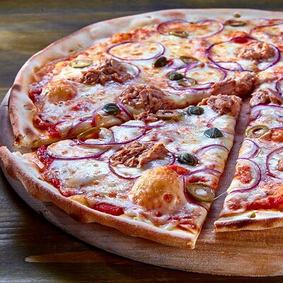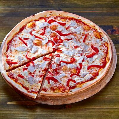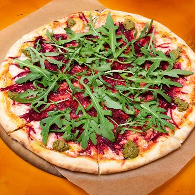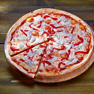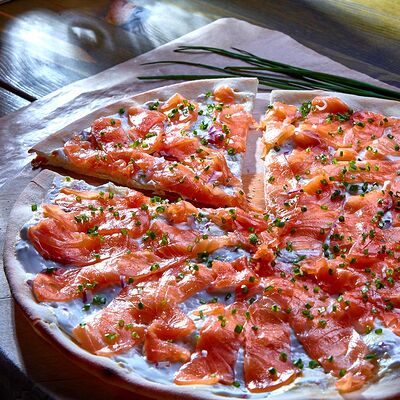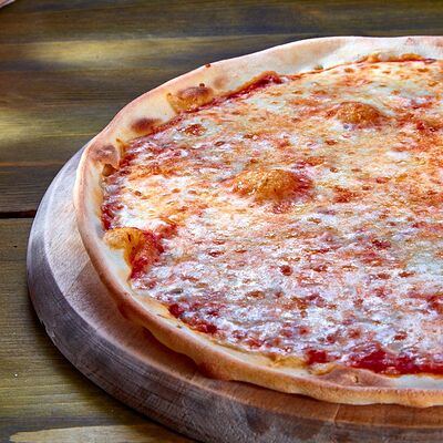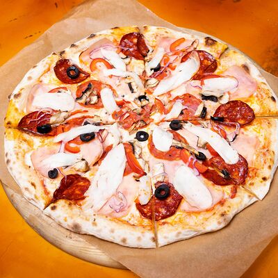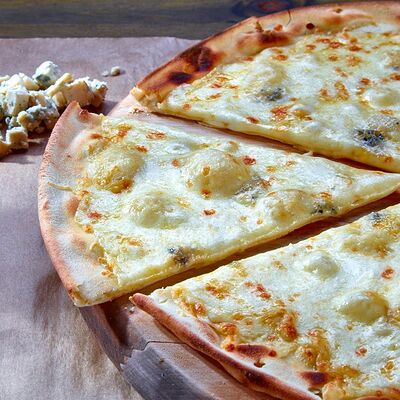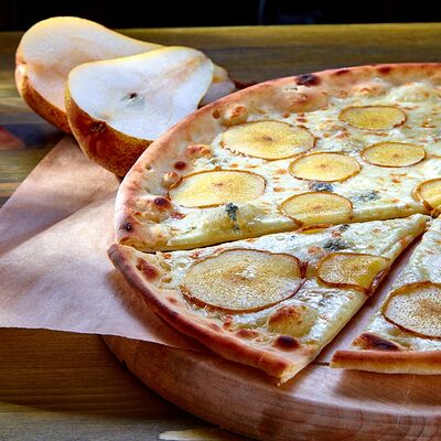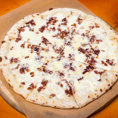 Сливочный соус, моцарелла, козий сыр, карамелизированный лук. Неаполитанская пицца в дровяной печи