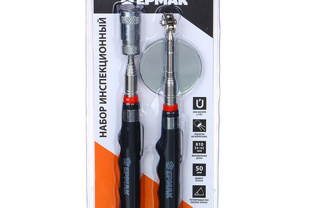 ЕРМАК Набор инспекционный, зеркало 50мм, магнит 2, 3кгс. 190-810мм- это телескопическое зеркало, которое применяется для диагностики и выявления дефектов. Смотровое зеркало помогает рассмотреть повреждение деталей на расстоянии в узких и труднодоступных местах.