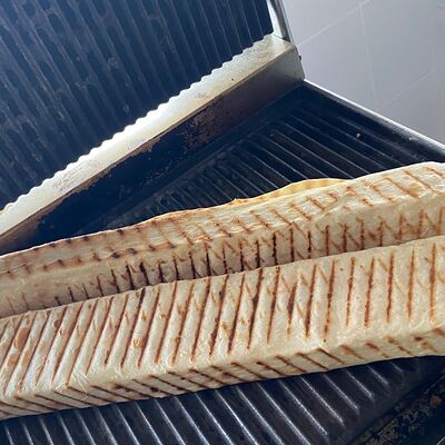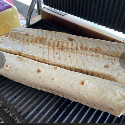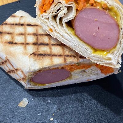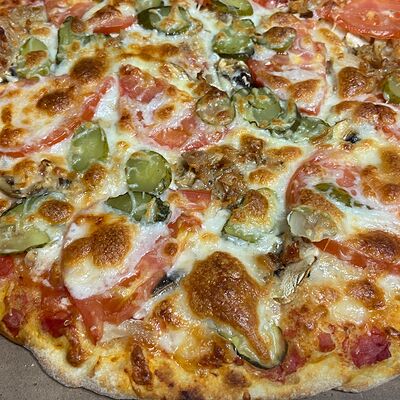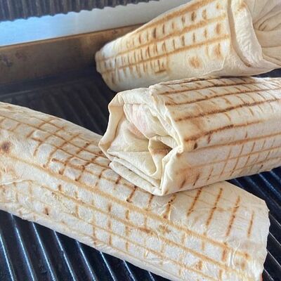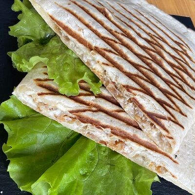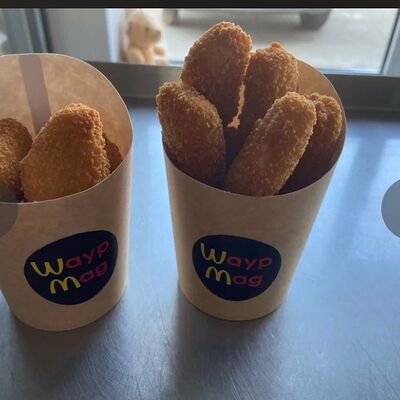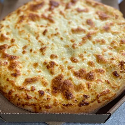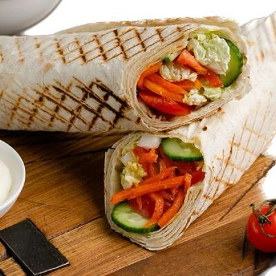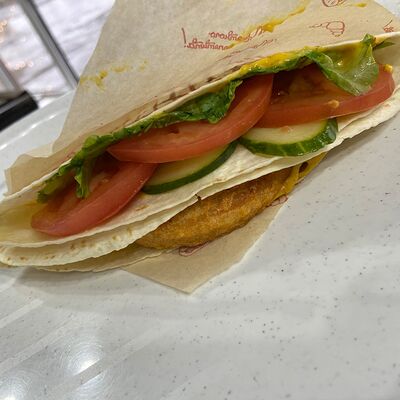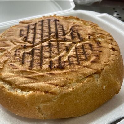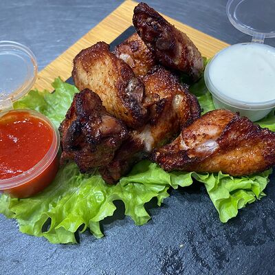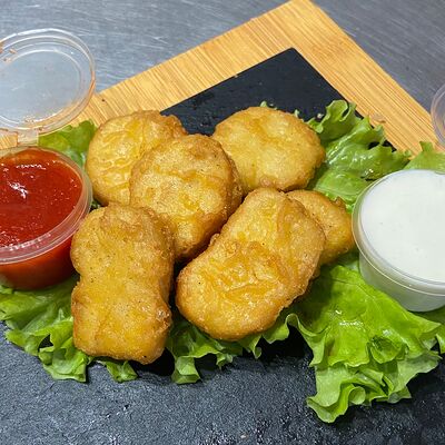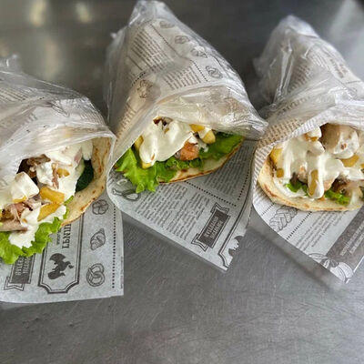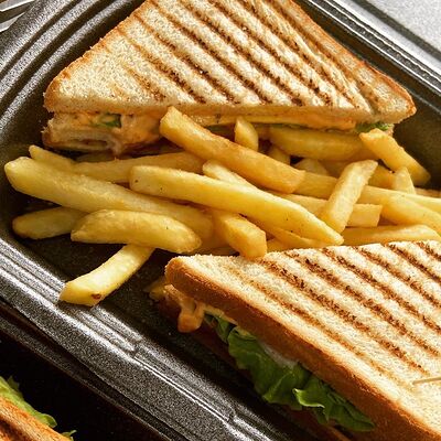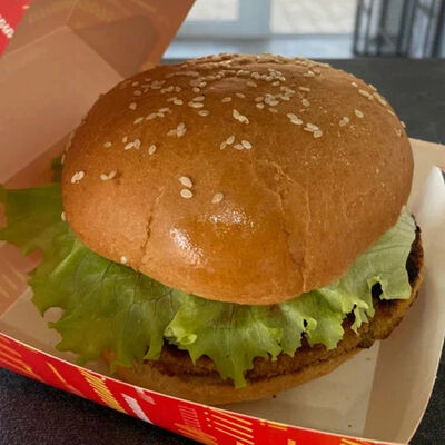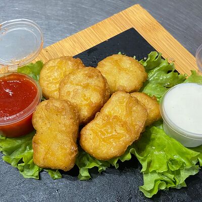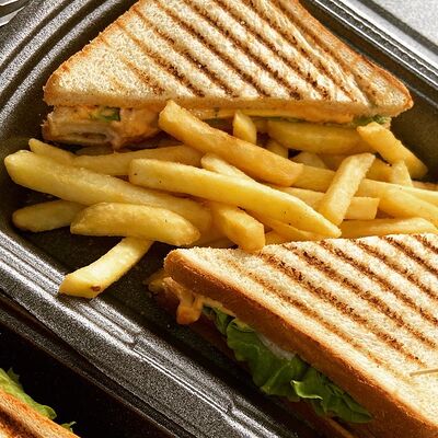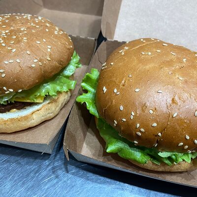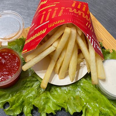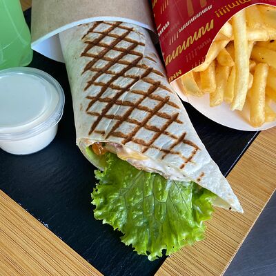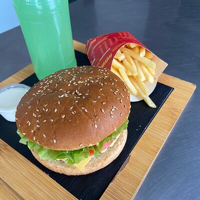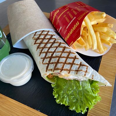 Булочка, соус гриль-бургер, лук фри, котлета куриная, сыр чеддер, помидор свежий, огурец солёный, лист салата, картофель фри, чесночный соус
