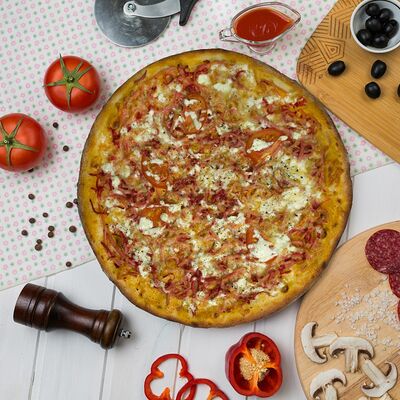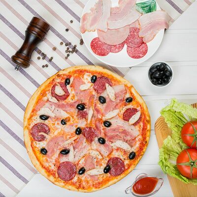 Помидоры свежие, колбаса пепперони, маслины, сыр Моцарелла, соус Помадоро, орегано, базилик (30 см)