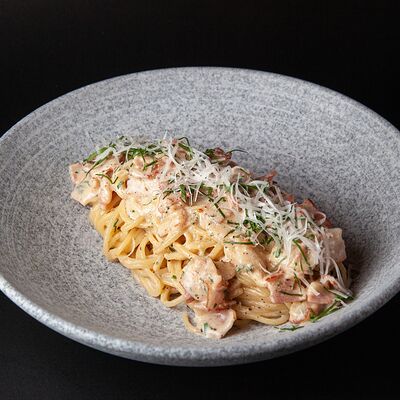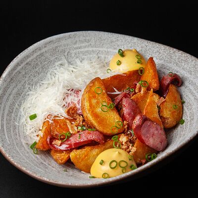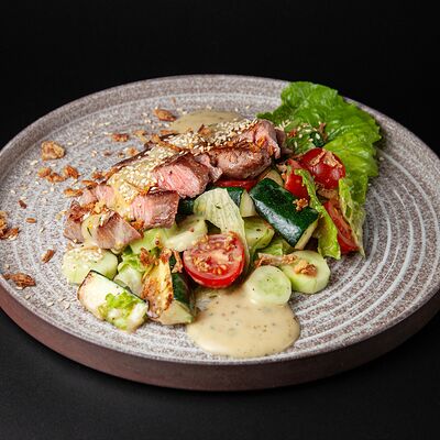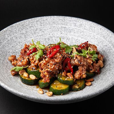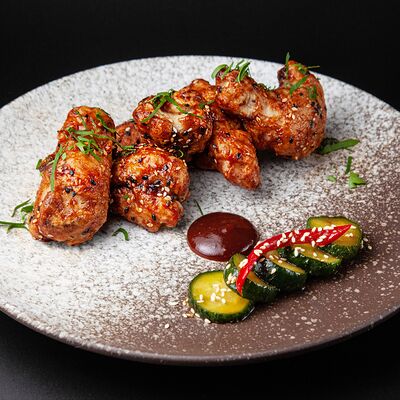 Куриные крылья, соус BBQ, морковь, петрушка, битые огурцы собственного приготовления, кунжут
