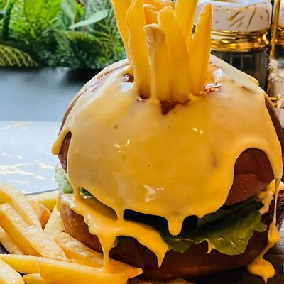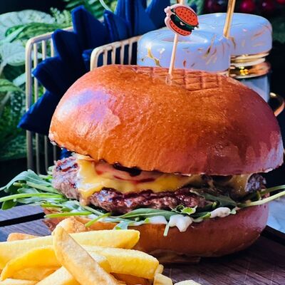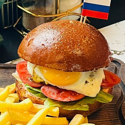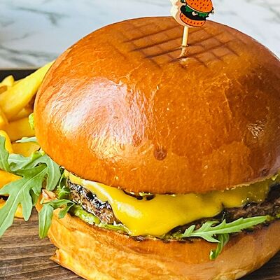 Булочка бриошь, котлета говяжья, сыр, руккола, соус блю чиз, картофель фри
