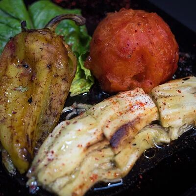 Мангал салат из запеченных баклажан, помидоров, сладкого перца с красным луком, зеленью и оливковым маслом