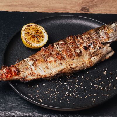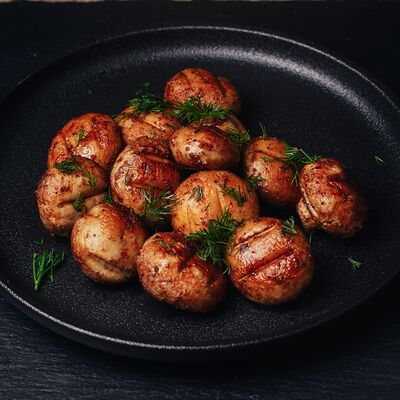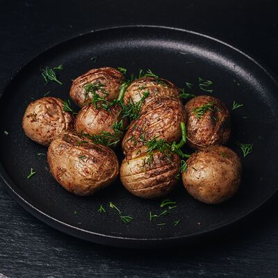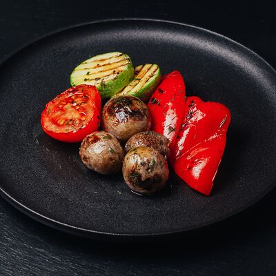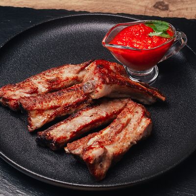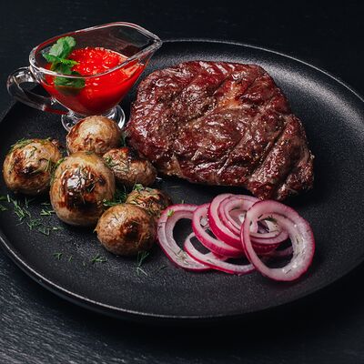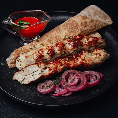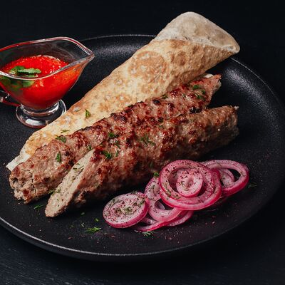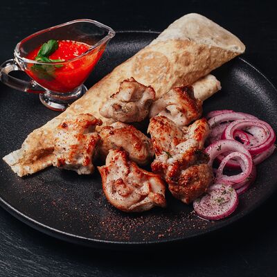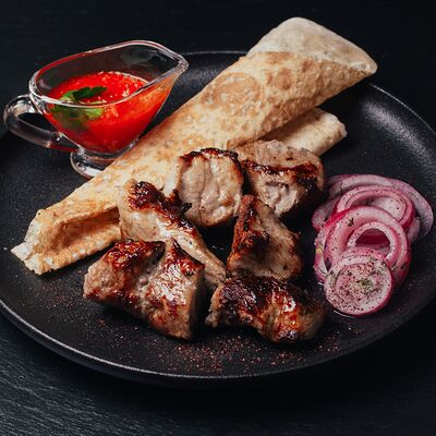 Мякоть говядины (толстый край), картофель, черри, лаваш, красный маринованный лук, специи, оливковое масло, аджика по-домашнему
