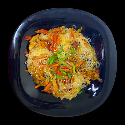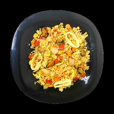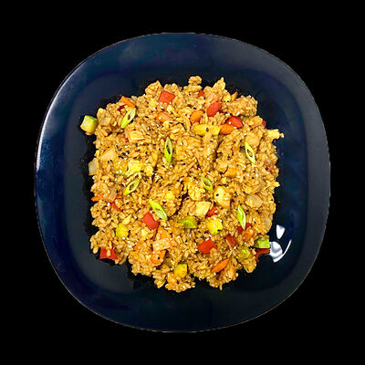 Рис, курица, лук, морковь, яйцо, перец, цукини, кунжут, лук зелёный, соус соевый