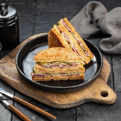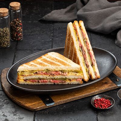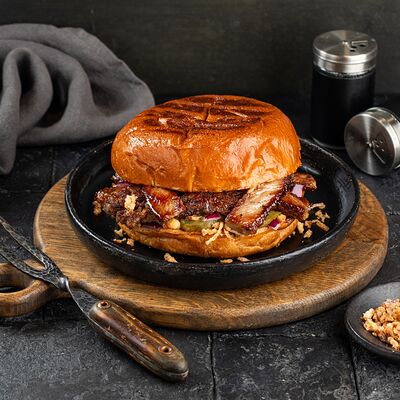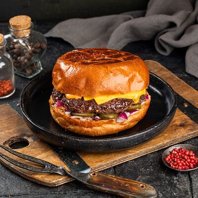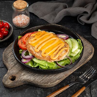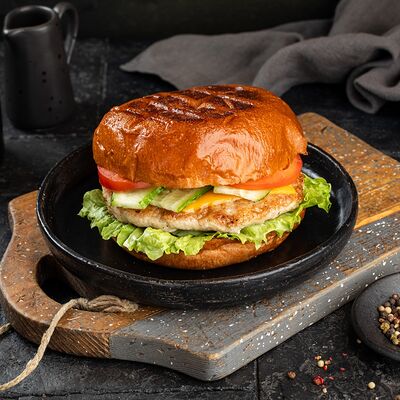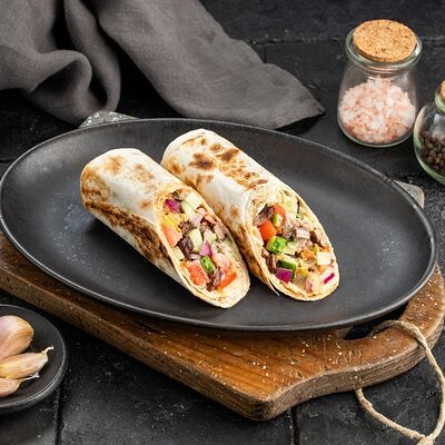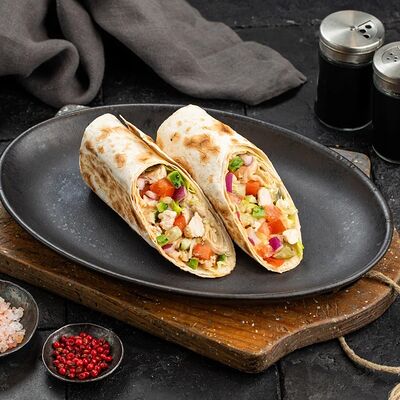 Лаваш, куриное филе, соус сметанно-чесночный, соус для бургера, салат айсберг, помидор, огурец свежий, огурец маринованный, лук красный репчатый, лук хрустящий жаренный