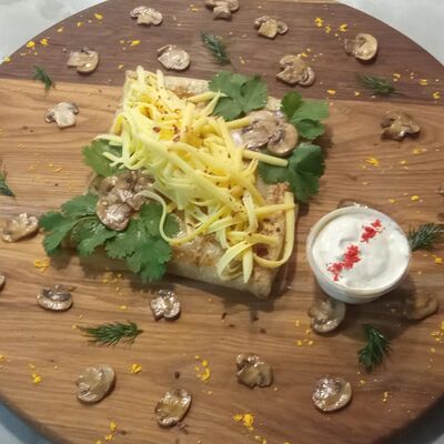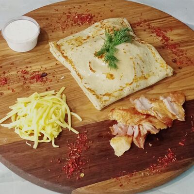 Молоко, мука, масло сливочное, яйцо, цыплёнок на гриле, жареные шампиньоны с луком, сыр полутвердый
