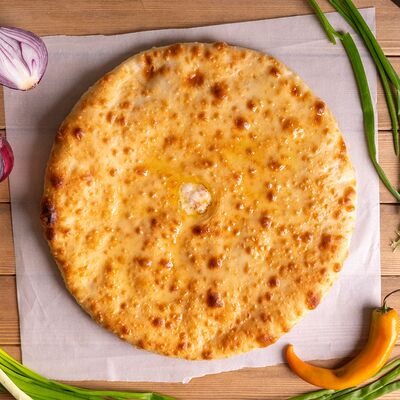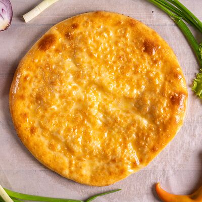 Обжаренный бекон, домашний осетинский сыр слабой соли, мука высшего сорта, вода, дрожжи, сливочное масло 82,5%, специи. Не содержит пальмового масла, без добавления творога вместо сыра, без усилителей вкуса, загустителей или консервантов (33 см)