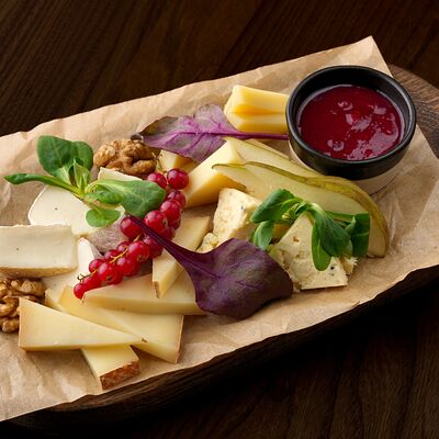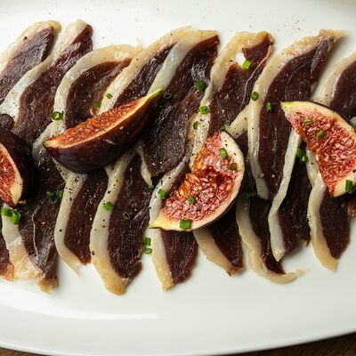 Гусь вяленый, сезонный фрукт (инжир), ягоды брусники