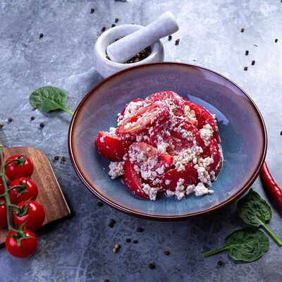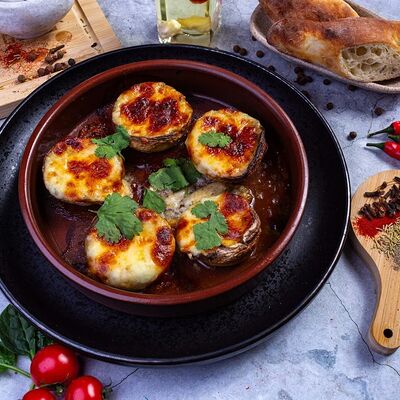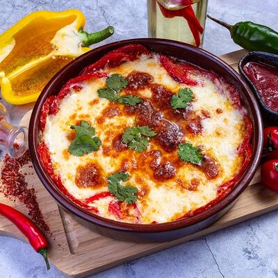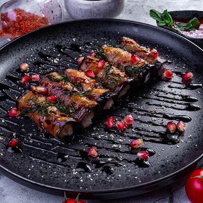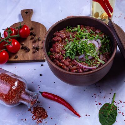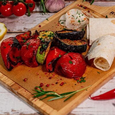 Овощи на мангале (баклажан, томаты, болгарский перец), лук красный, кинза, чеснок, масло сливочное, специи