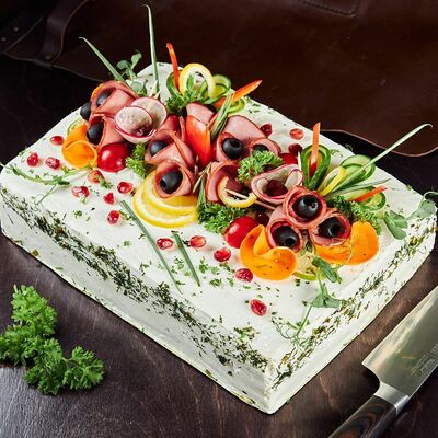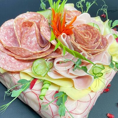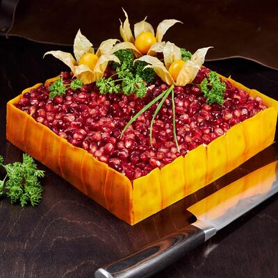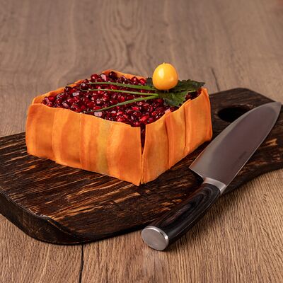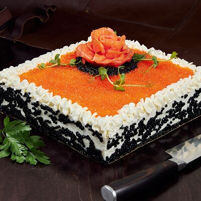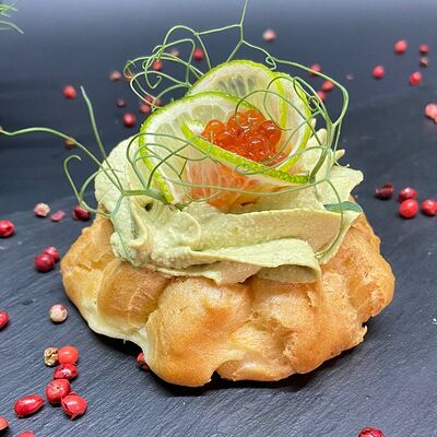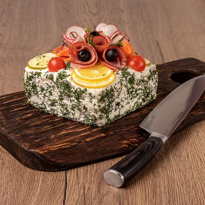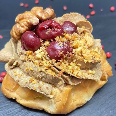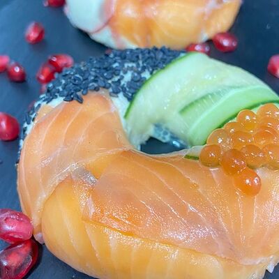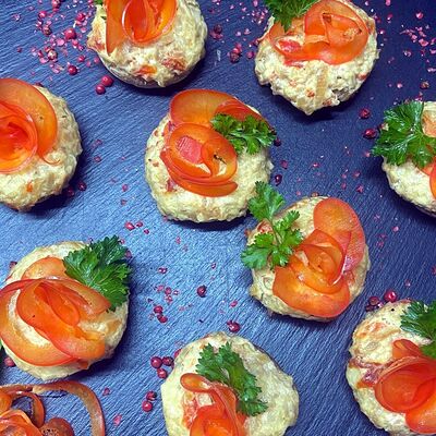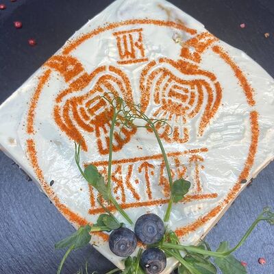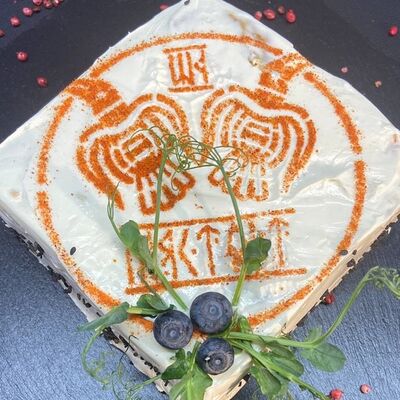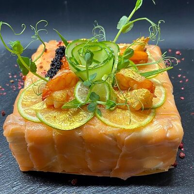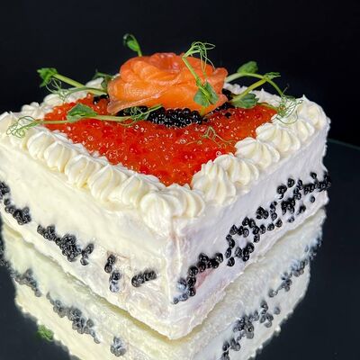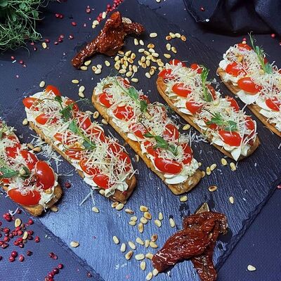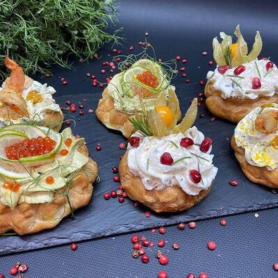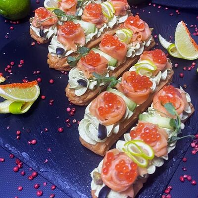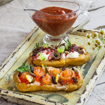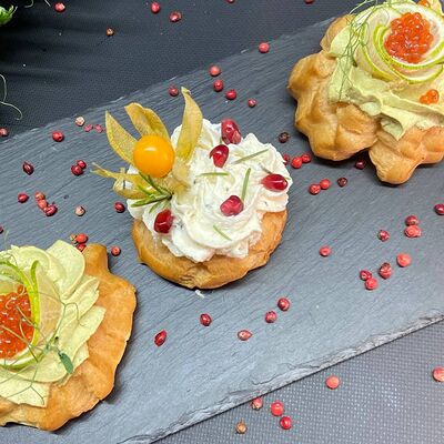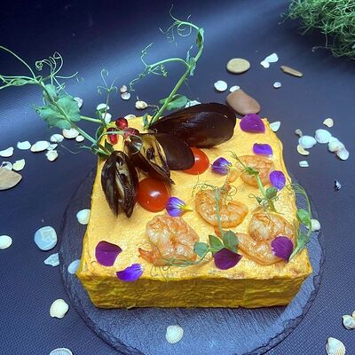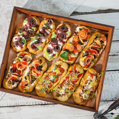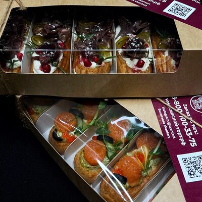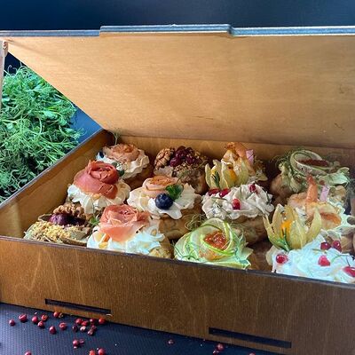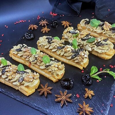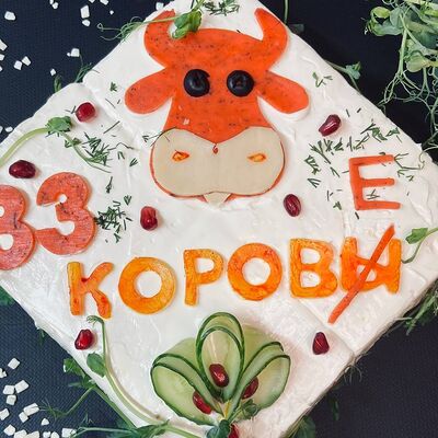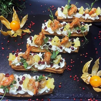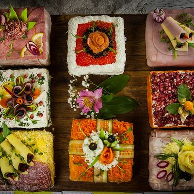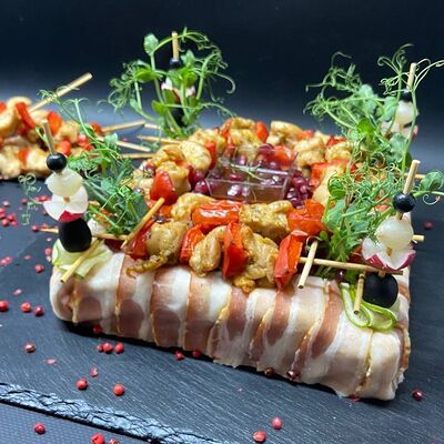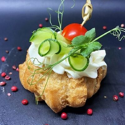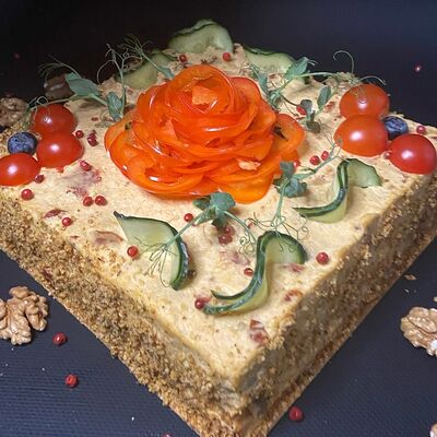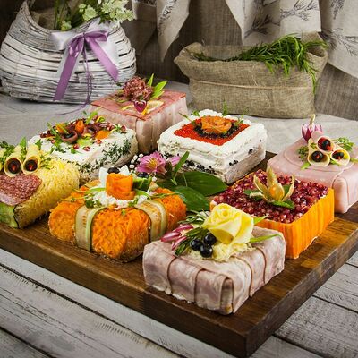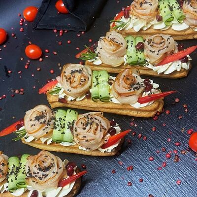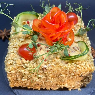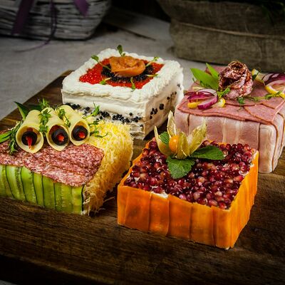 Телятина, приготовленная по технологии Су-Вид с пряными травами и разделённая на волокна, овощи Альденте (сладкий перец, лук, морковь, томат), огуречный релиш, сливочный сыр, пшеничные тосты, пропитанные белым соусом с добавлением хереса