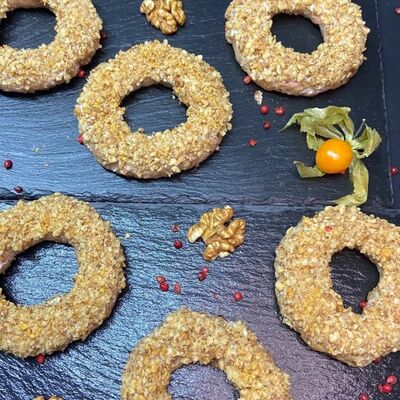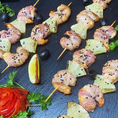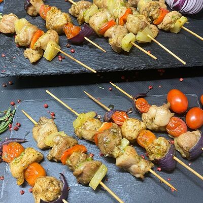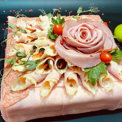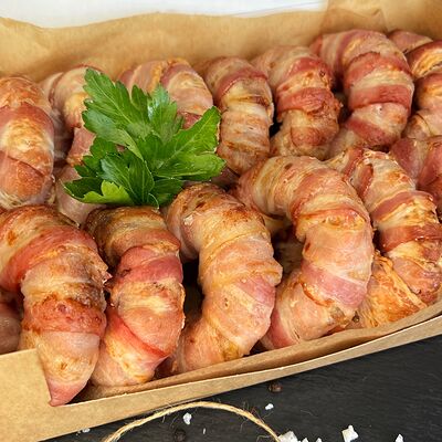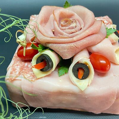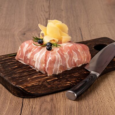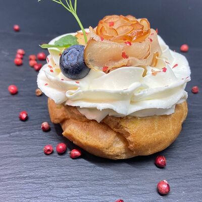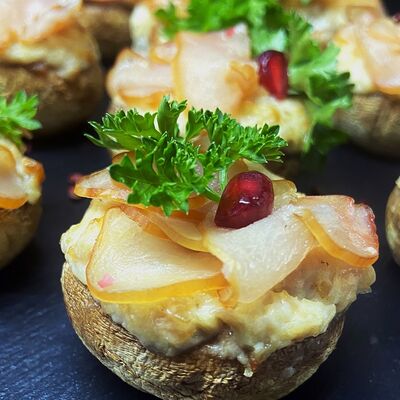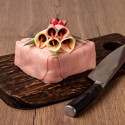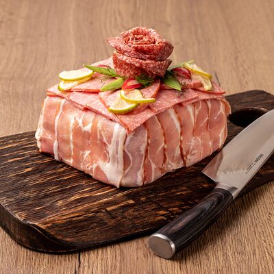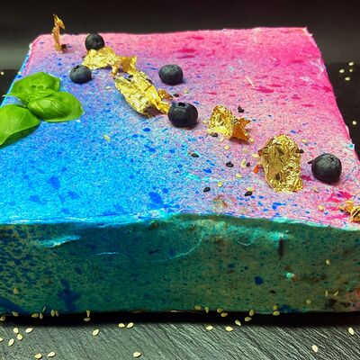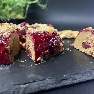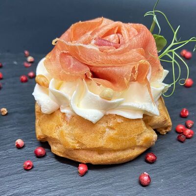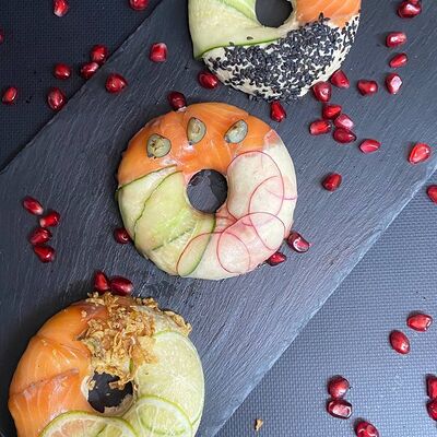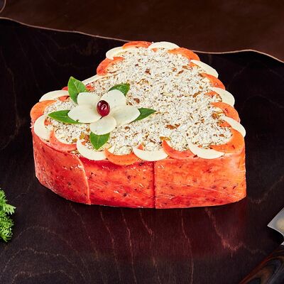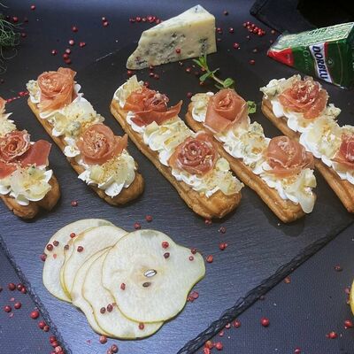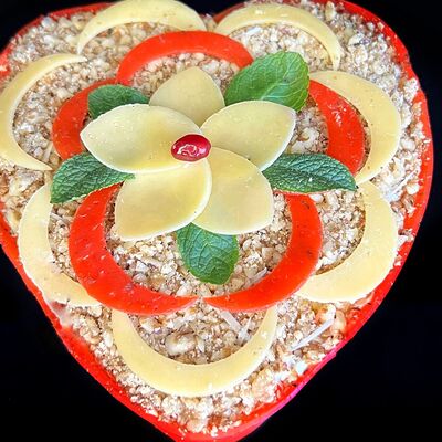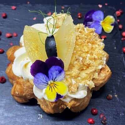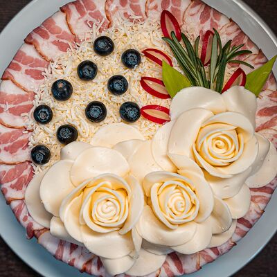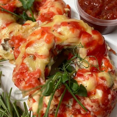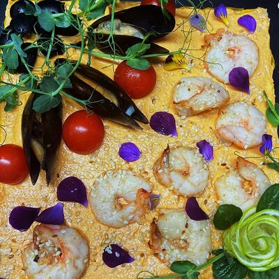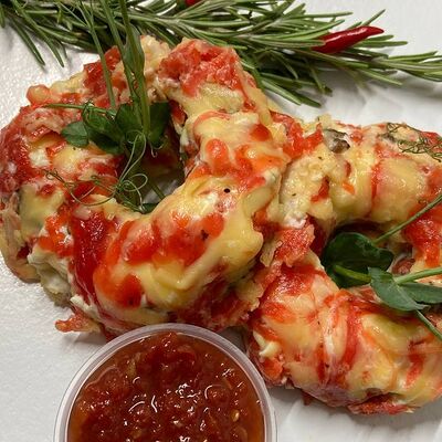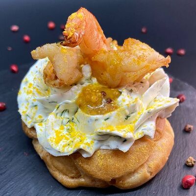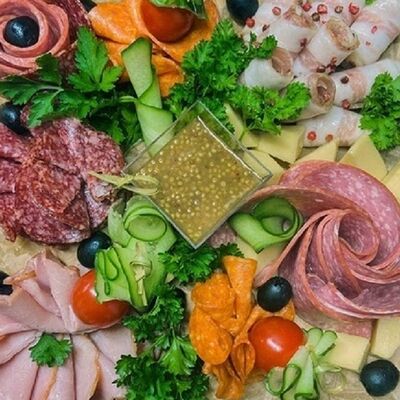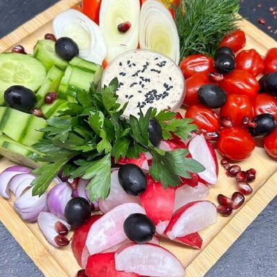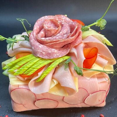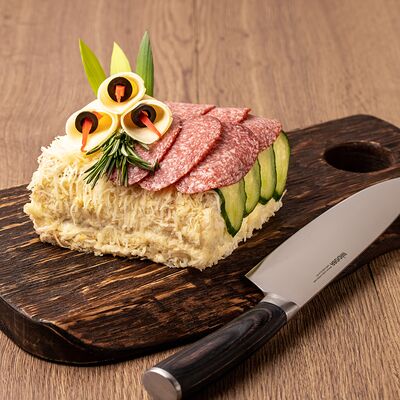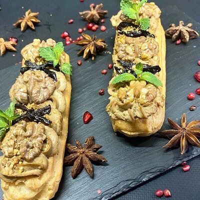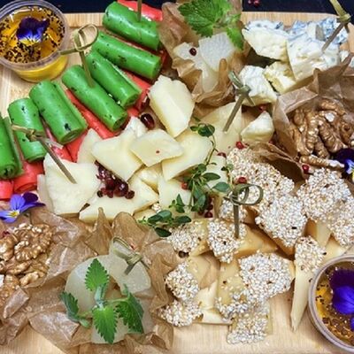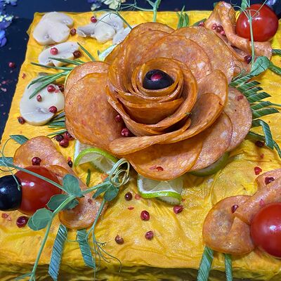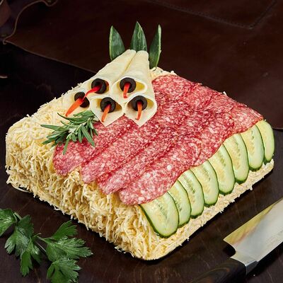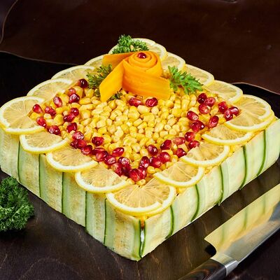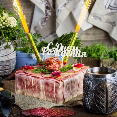 Телятина, приготовленная по технологии Су-Вид с пряными травами и разделённая на волокна, овощи Альденте (сладкий перец, лук, морковь, томат), огуречный релиш, сливочный сыр, пшеничные тосты, пропитанные белым соусом с добавлением хереса