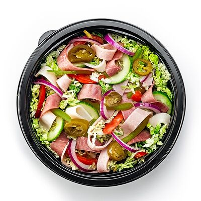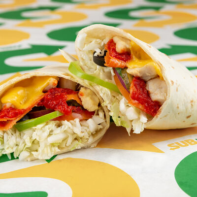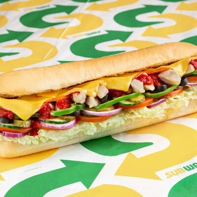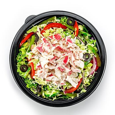 Кусочки курицы в сочетании с пряными колбасками пепперони, соус и свежие овощи на свежевыпеченном хлебе на ваш выбор