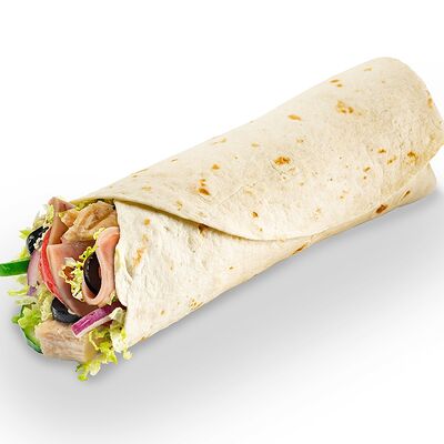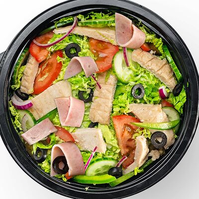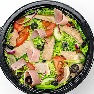 Филе грудки (60 г), ветчина (2 слайса), сыр чеддер (2 слайса), все овощи по формуле по желанию гостя, соус грибной (3 полоски)