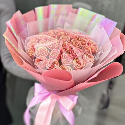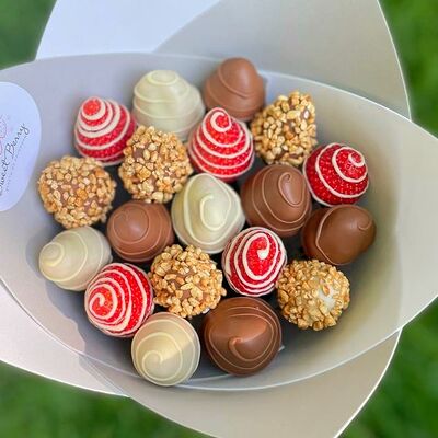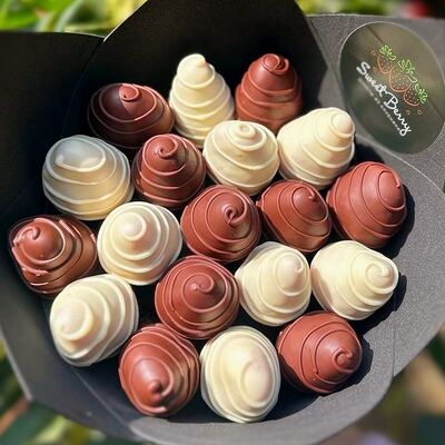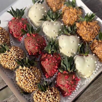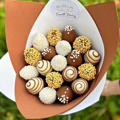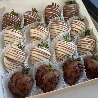 Клубника отборная (17-19 шт., в зависимости от калибра ягоды, вес не меняется), шоколад Callebaut белый, шоколад Callebaut молочный, вафля хрустящая, шарики кондитерские, голубика, мята, дизайнерская упаковочная бумага, лента атласная, пленка флористическая