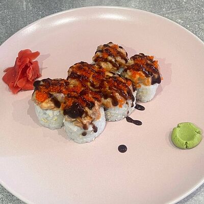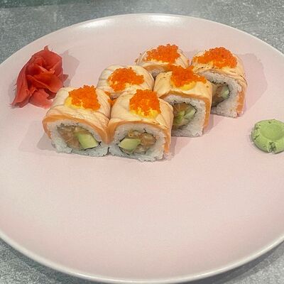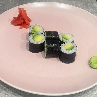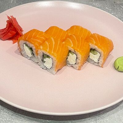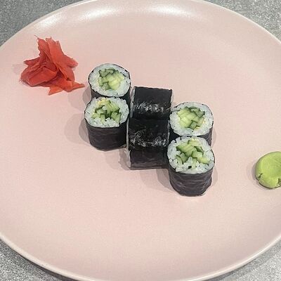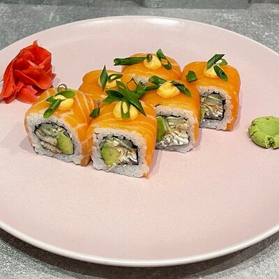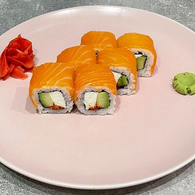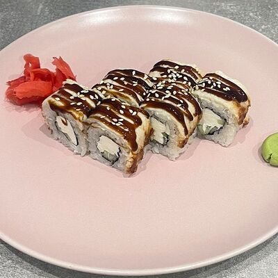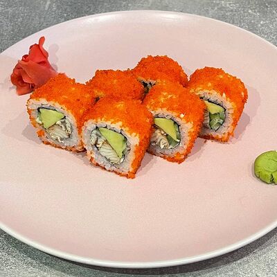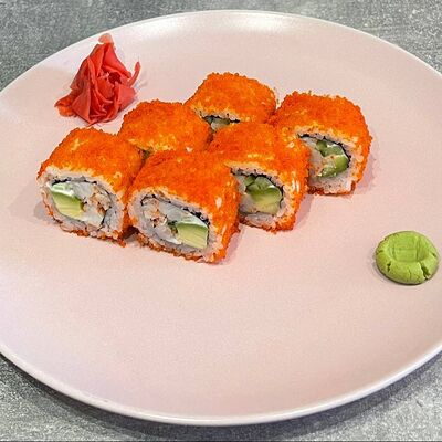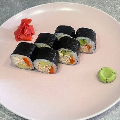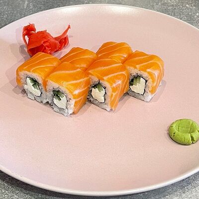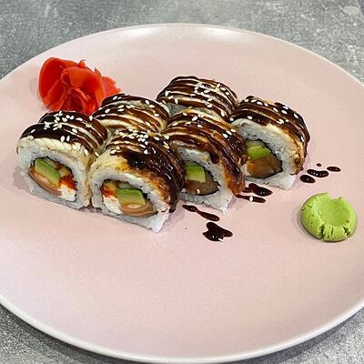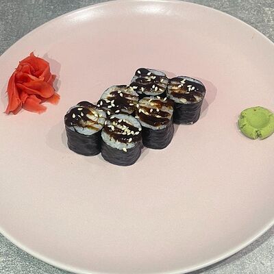 Рис, нори, огурец, авокадо, сыр филадельфия, угорь, креветка, соус унаги, кунжут, имбирь, соевый соус, васаби