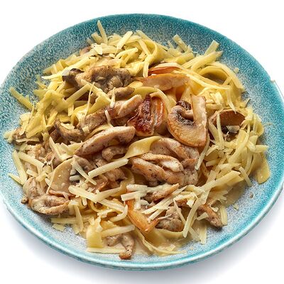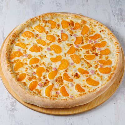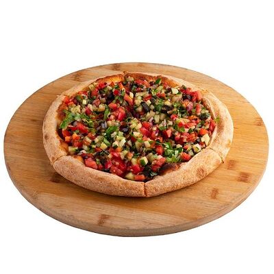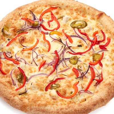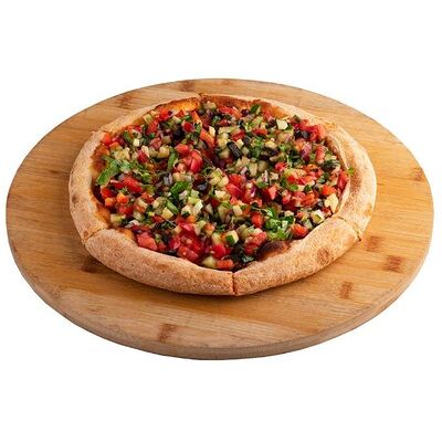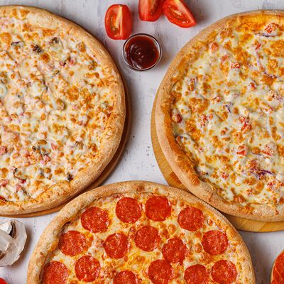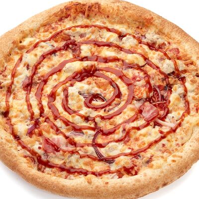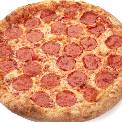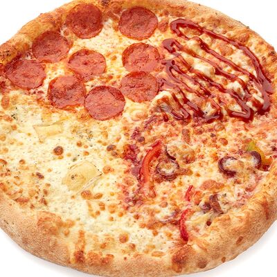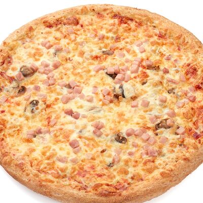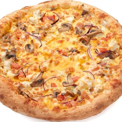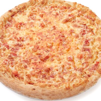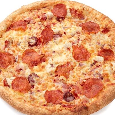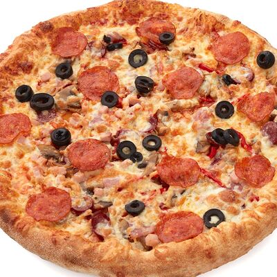 Томатная основа с сочной мясной начинкой: пепперони, ветчина, бекон, мини салями и овощами (лук, грибы, маслины)