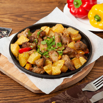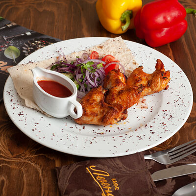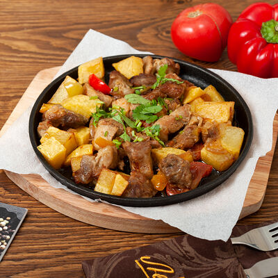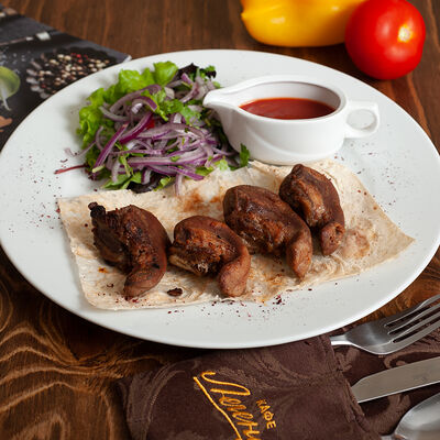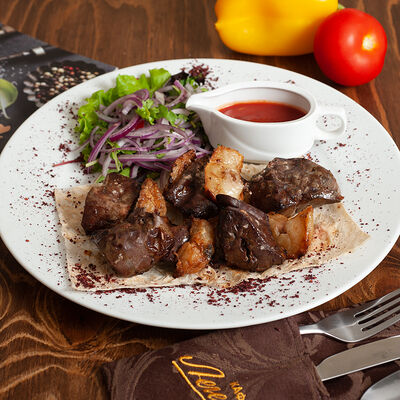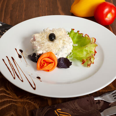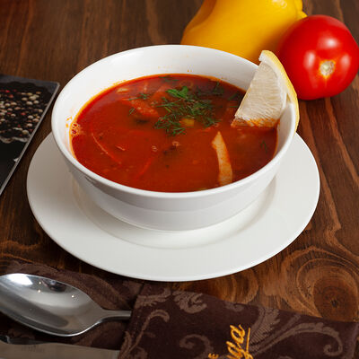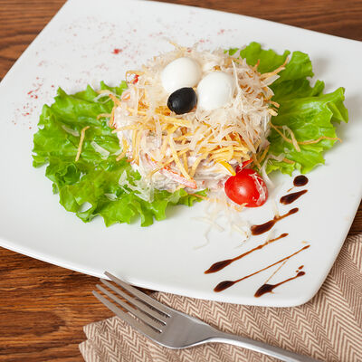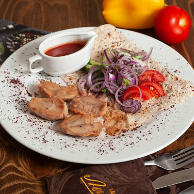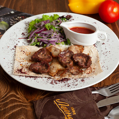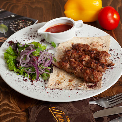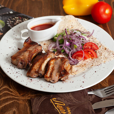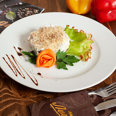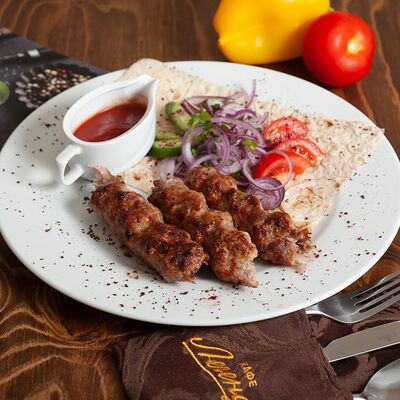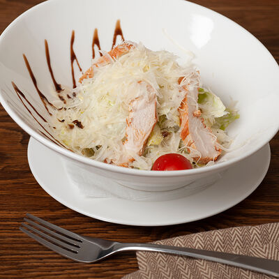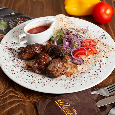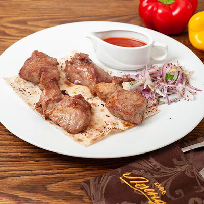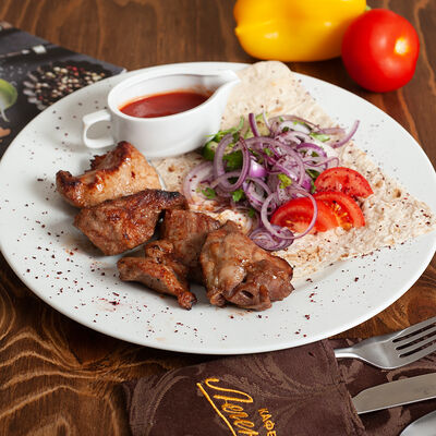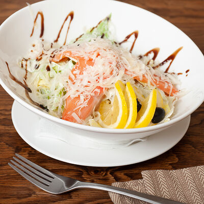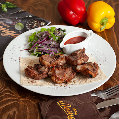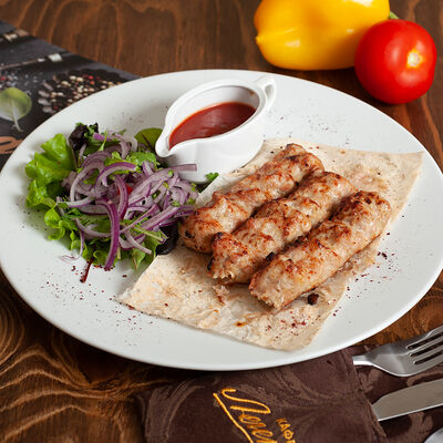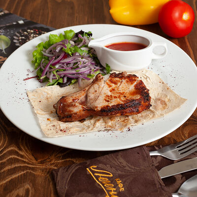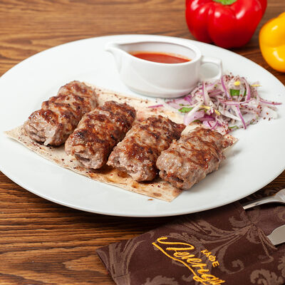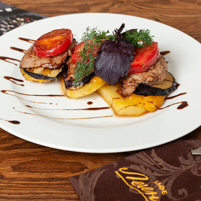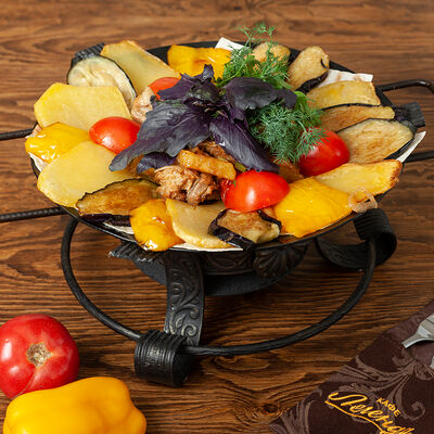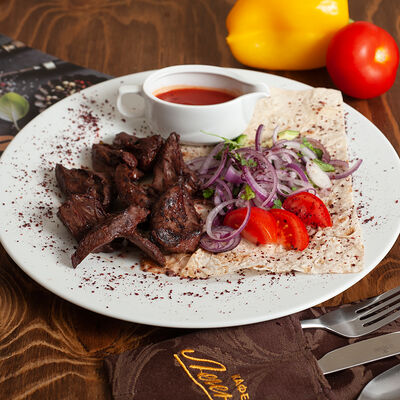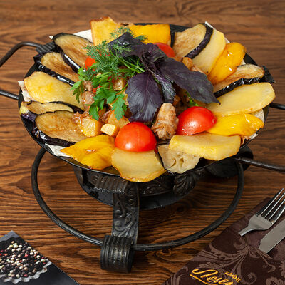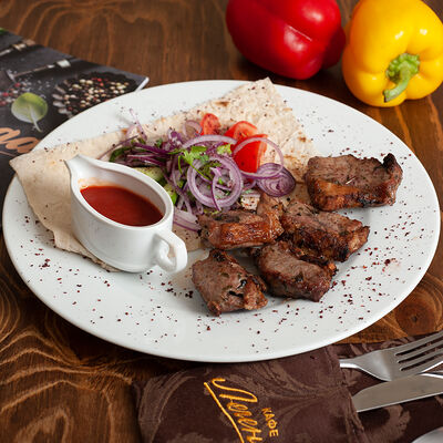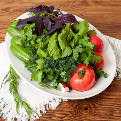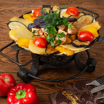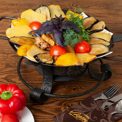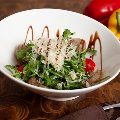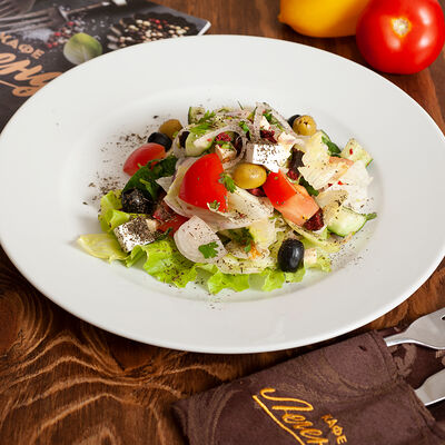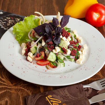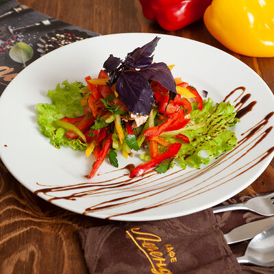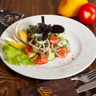 Говядина гриль, перец болгарский, огурцы, помидоры, лук зелёный, чеснок, кинза, кунжут, кунжутное масло, соевый соус