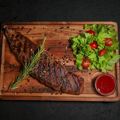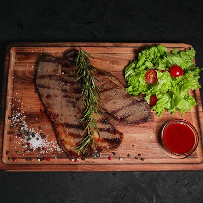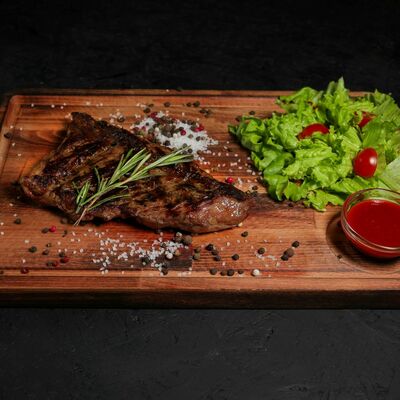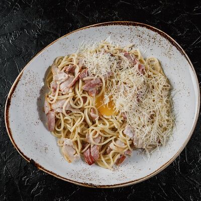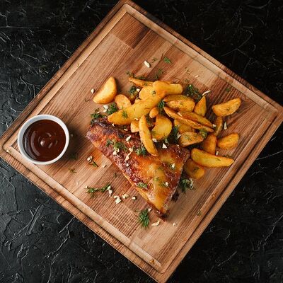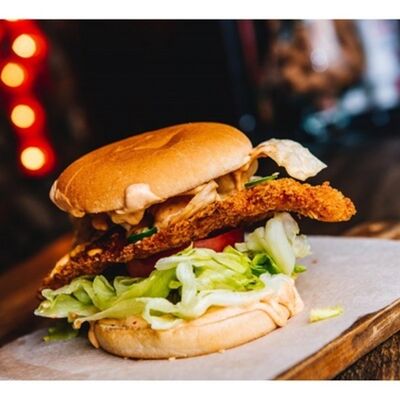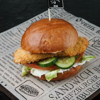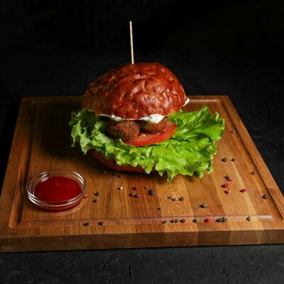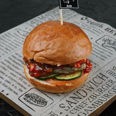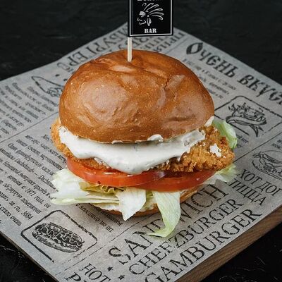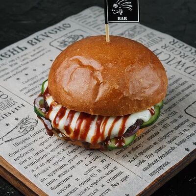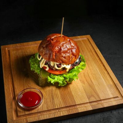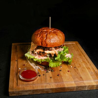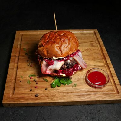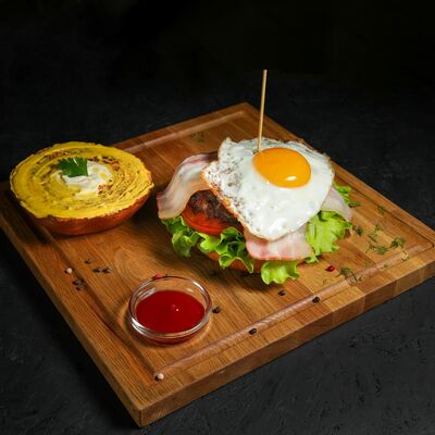Котлета из говядины, булочка, томат, салат айсберг, сыр, красный лук, бекон, яичница, соус на основе майонеза и горчицы