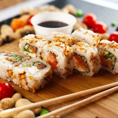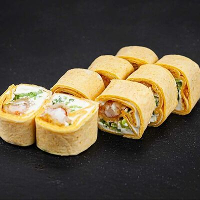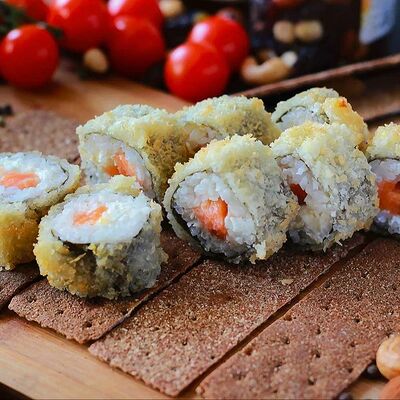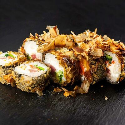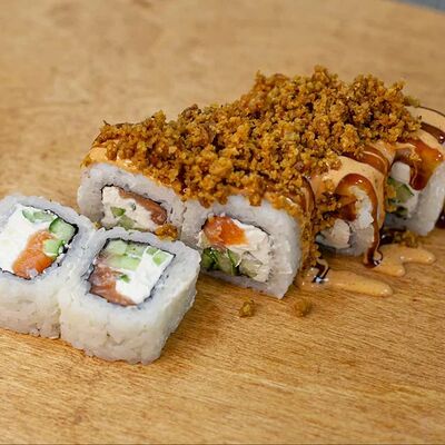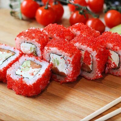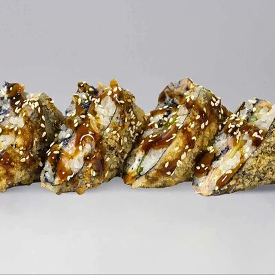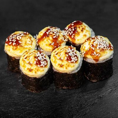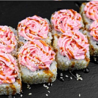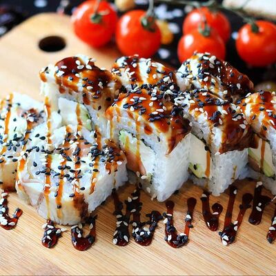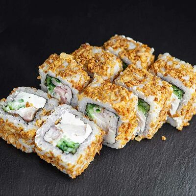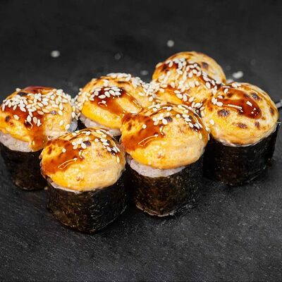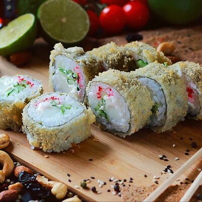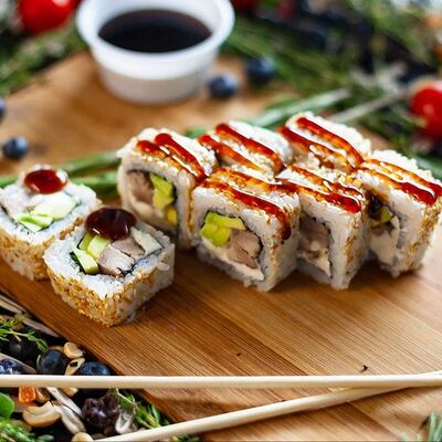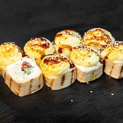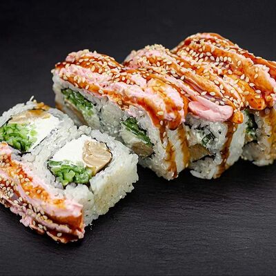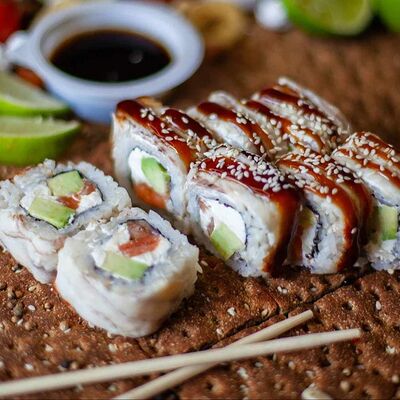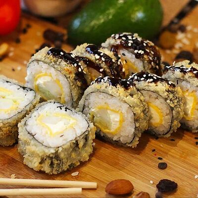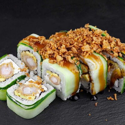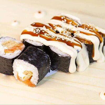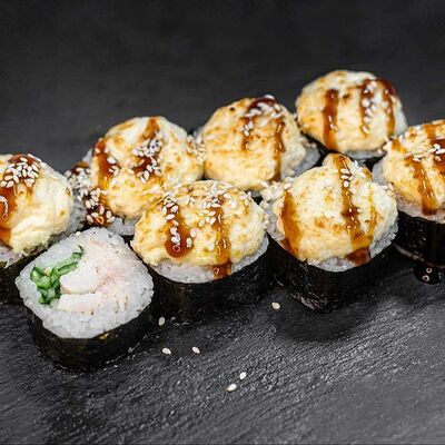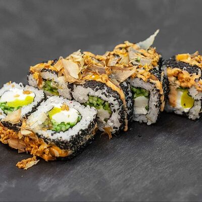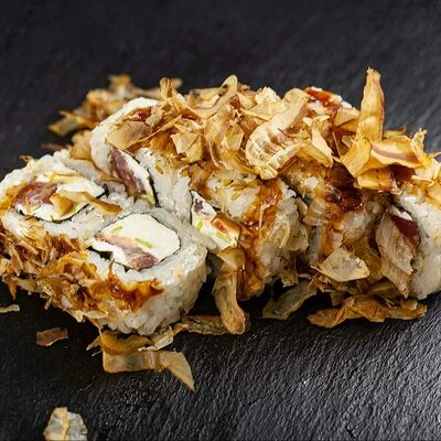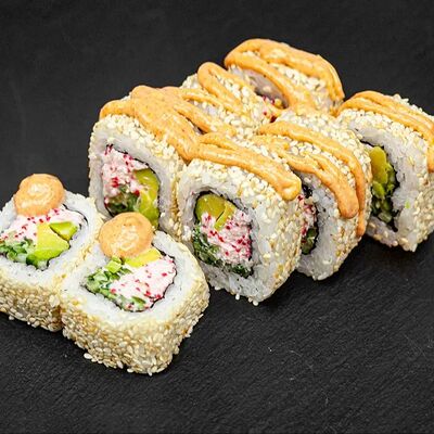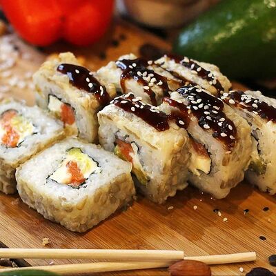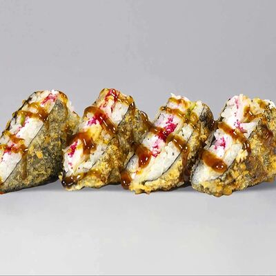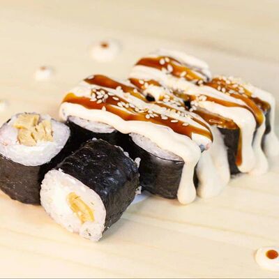 Сыр сливочный Cremette, креветка темпура, авокадо, такуан, темпура, соус унаги, кунжут, рис, нори. В комплект входит соевый соус (25 г)