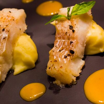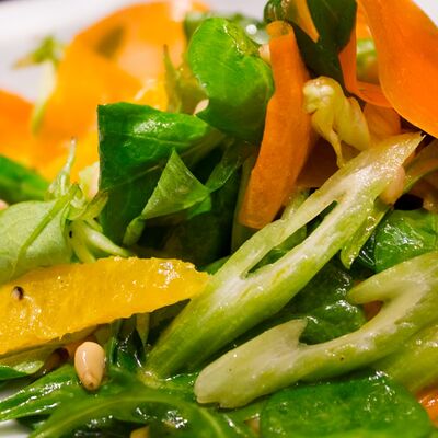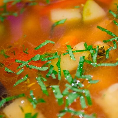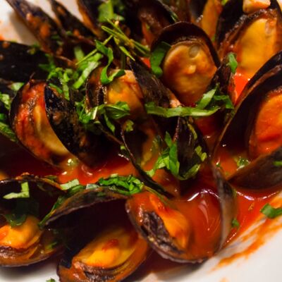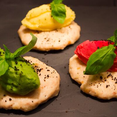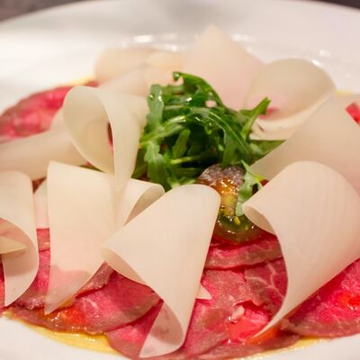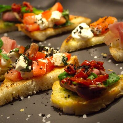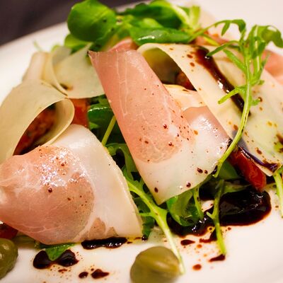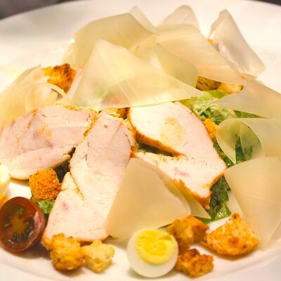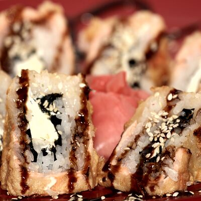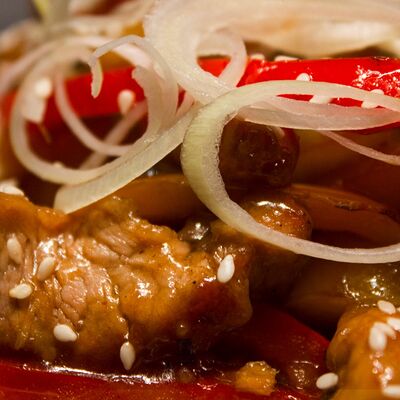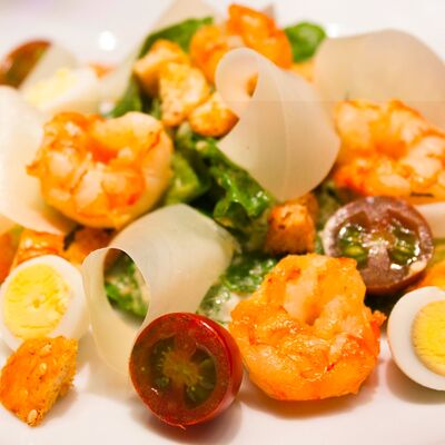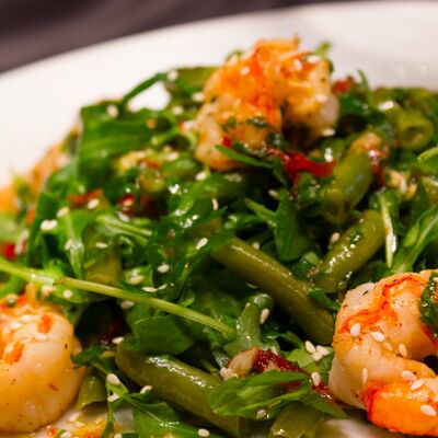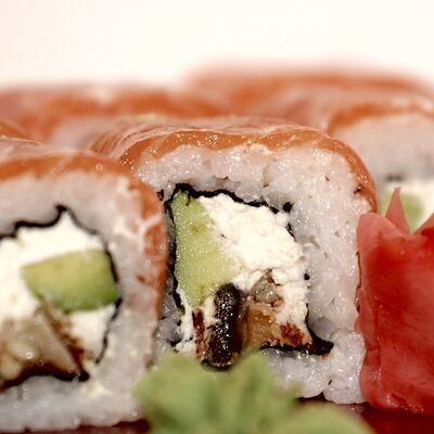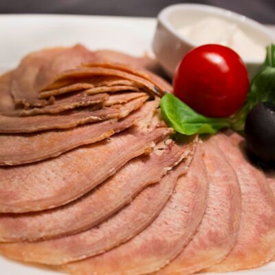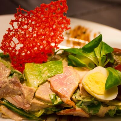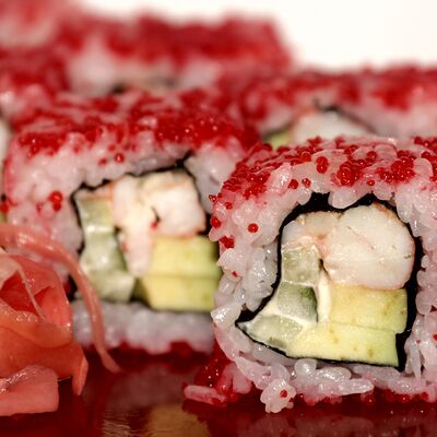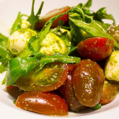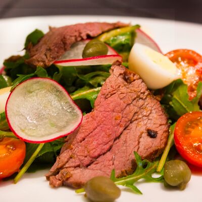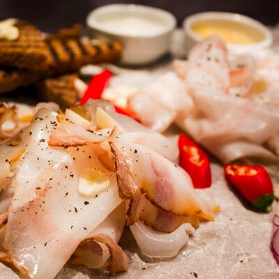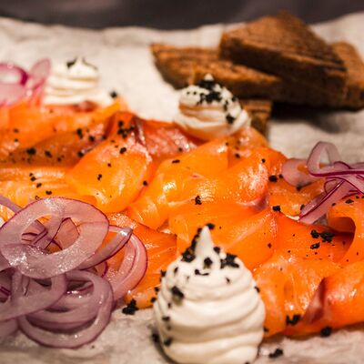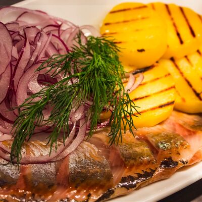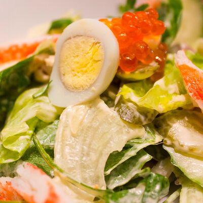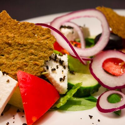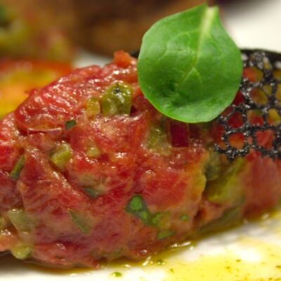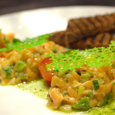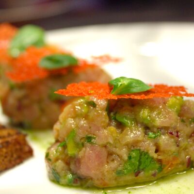 Тунец охлажденный, помидор, авокадо, красный лук, зелень, маринад, бородинские гренки