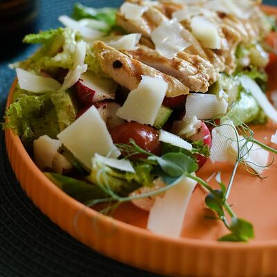 Огурец, черри, редис, листья салата, пармезан, курица, специи, оливковое масло