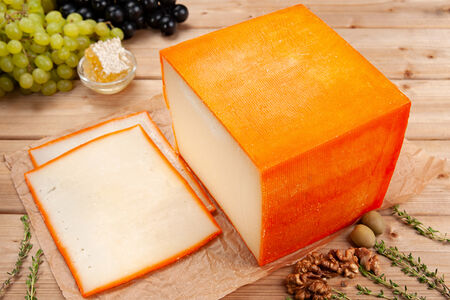 Состав: молоко нормализованное, соль пищевая (антислеживающий агент Е536), уплотнитель - хлорид кальция, консервант - нитрат натрия, ферментный препарат животного происхождения лизоцим, закваска на чистых культурах молочнокислых микроорганизмов, молокосвертывающий фермент микробного происхождения (содержит консервант бензоат натрия), краситель "Аннато", содержит регулятор кислотности - гидроксид калия, ферментный препарат животного происхождения липаза, консервант натамицин (Е235).